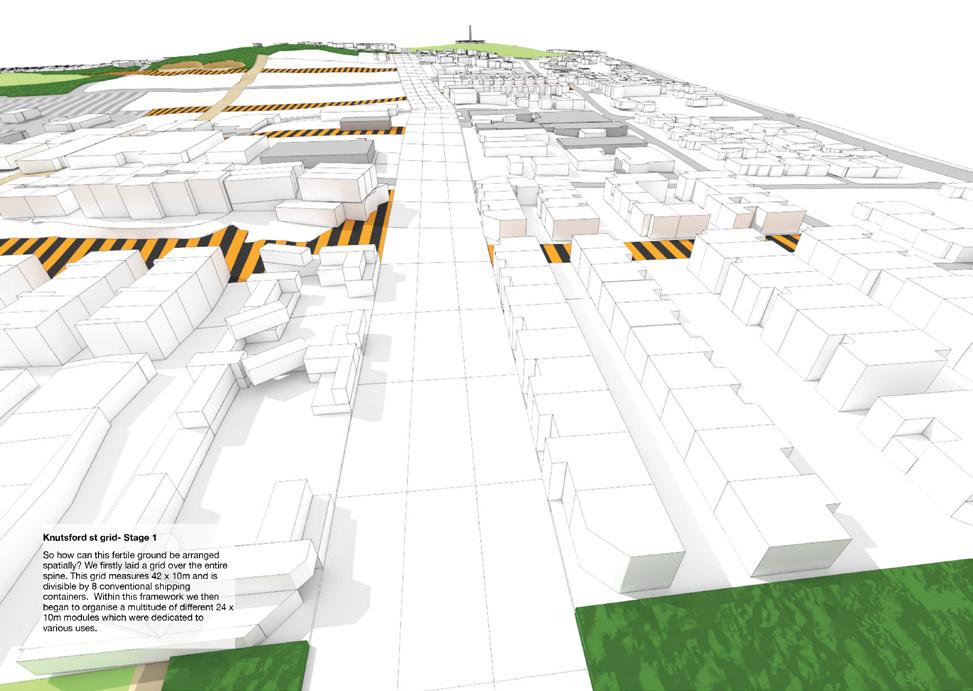 So how can this fertile ground be arranged spatially? We firstly laid a grid over the entire spine. This grid measures 42 x 10m and is divisible by 8 conventional shipping containers. Within this framework we then began to organise a multitude of different 24 x 10m modules which were dedicated to various uses