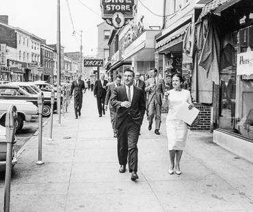 St. Clair Wright points out historic buildings on lower Main Street to Secretary of the Interior Stewart Udall on July 7, 1965. Udall was in Annapolis to recognize the historic district as a Registered National Historic Landmark. (M.E. Warren, 1965). Caption: Maryland State Archives