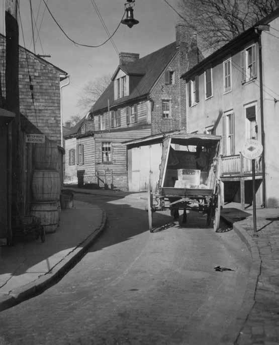 Early 20th-century photograph (undated) of Pinkney Street. Shiplap House (background), the oldest portion of which dates to about 1715, serves as the headquarters of Historic Annapolis today. Over three centuries, the building has housed a tavern, a single-family dwelling, a store, the art studio of Francis Blackwell Mayer, a multi-unit tenement, and office spaces. Historic Annapolis purchased the building in 1957 to save it from demolition and restored the vernacular Georgian building to its early appearance. This picturesque view has been captured by artists and photographers for over a century.