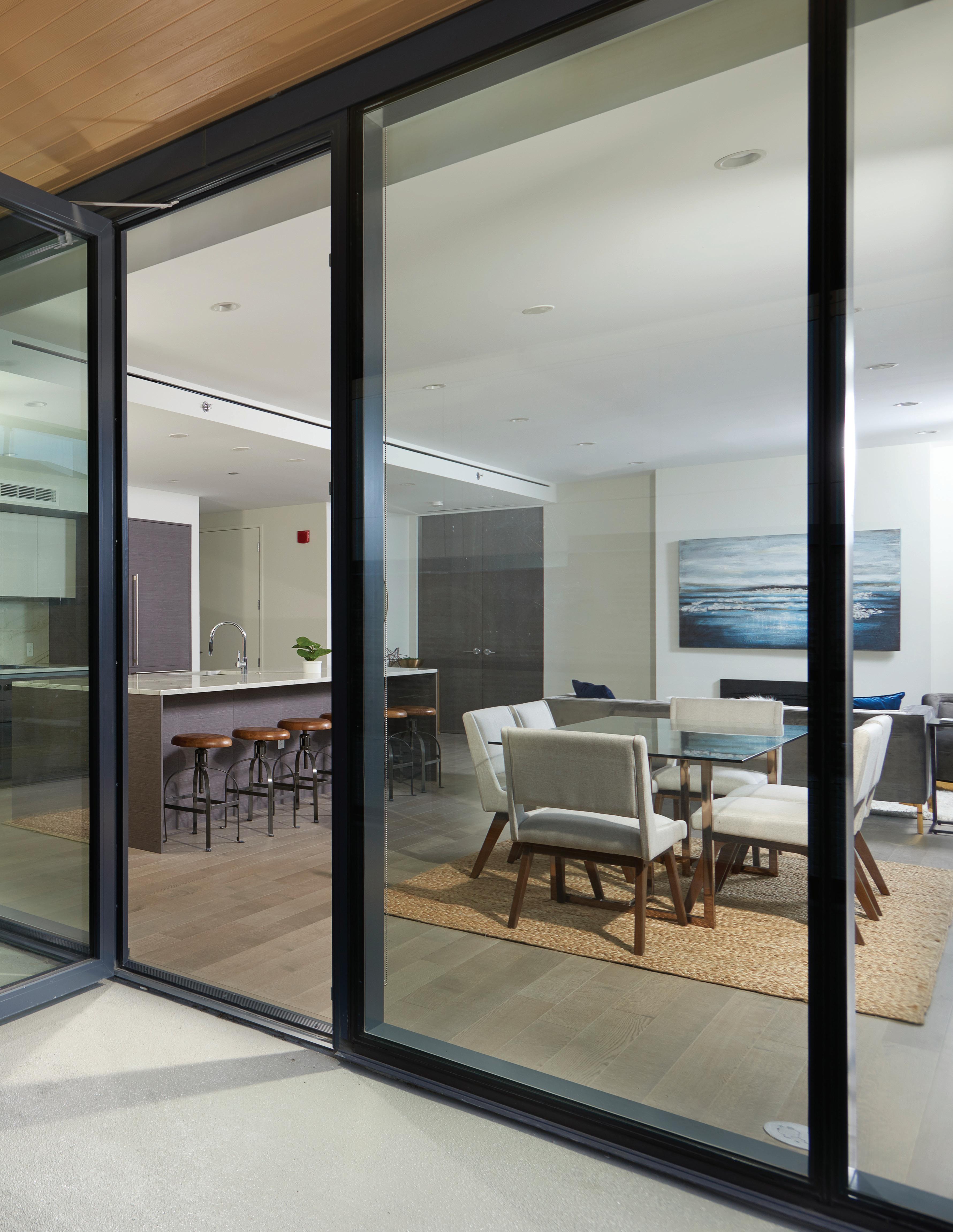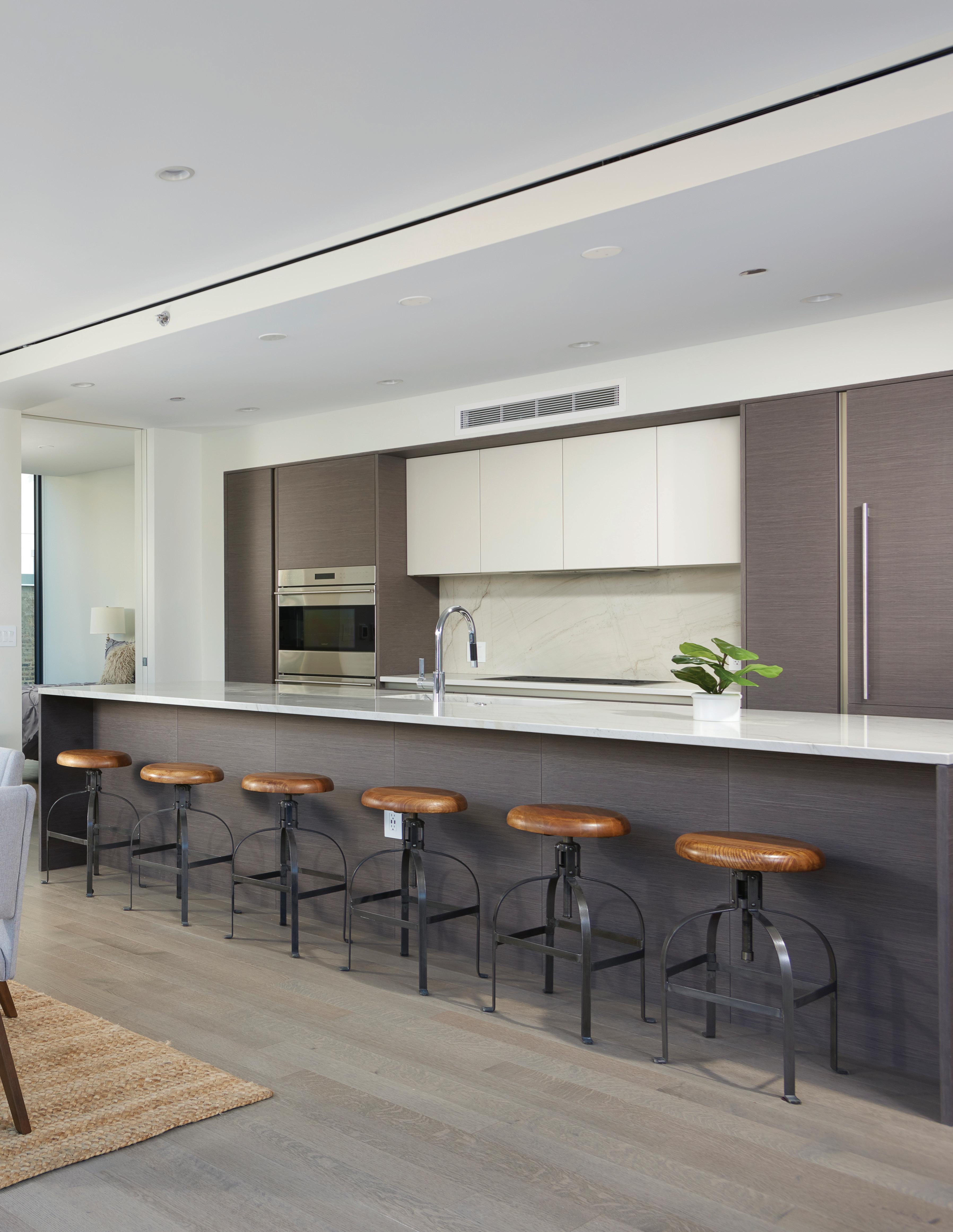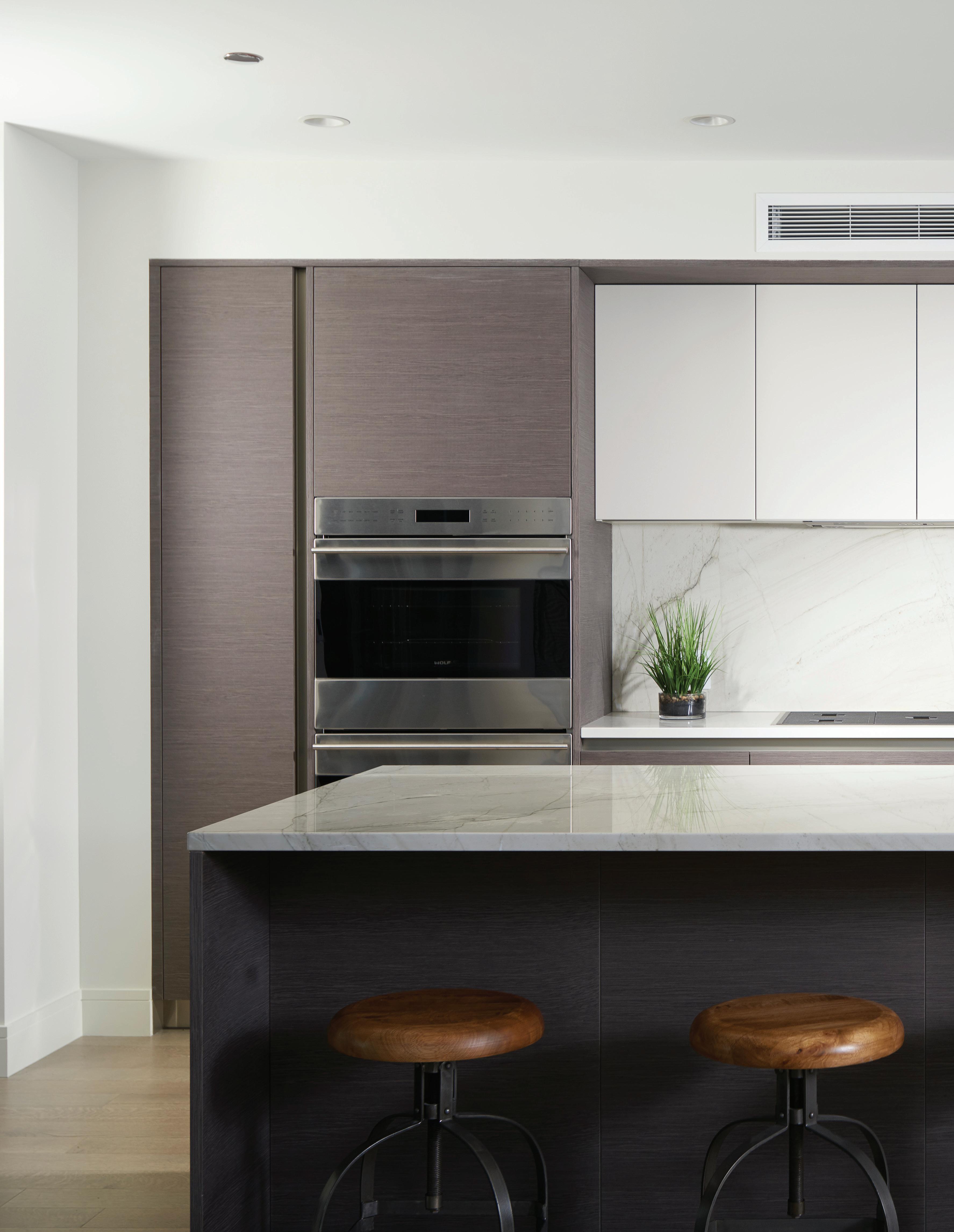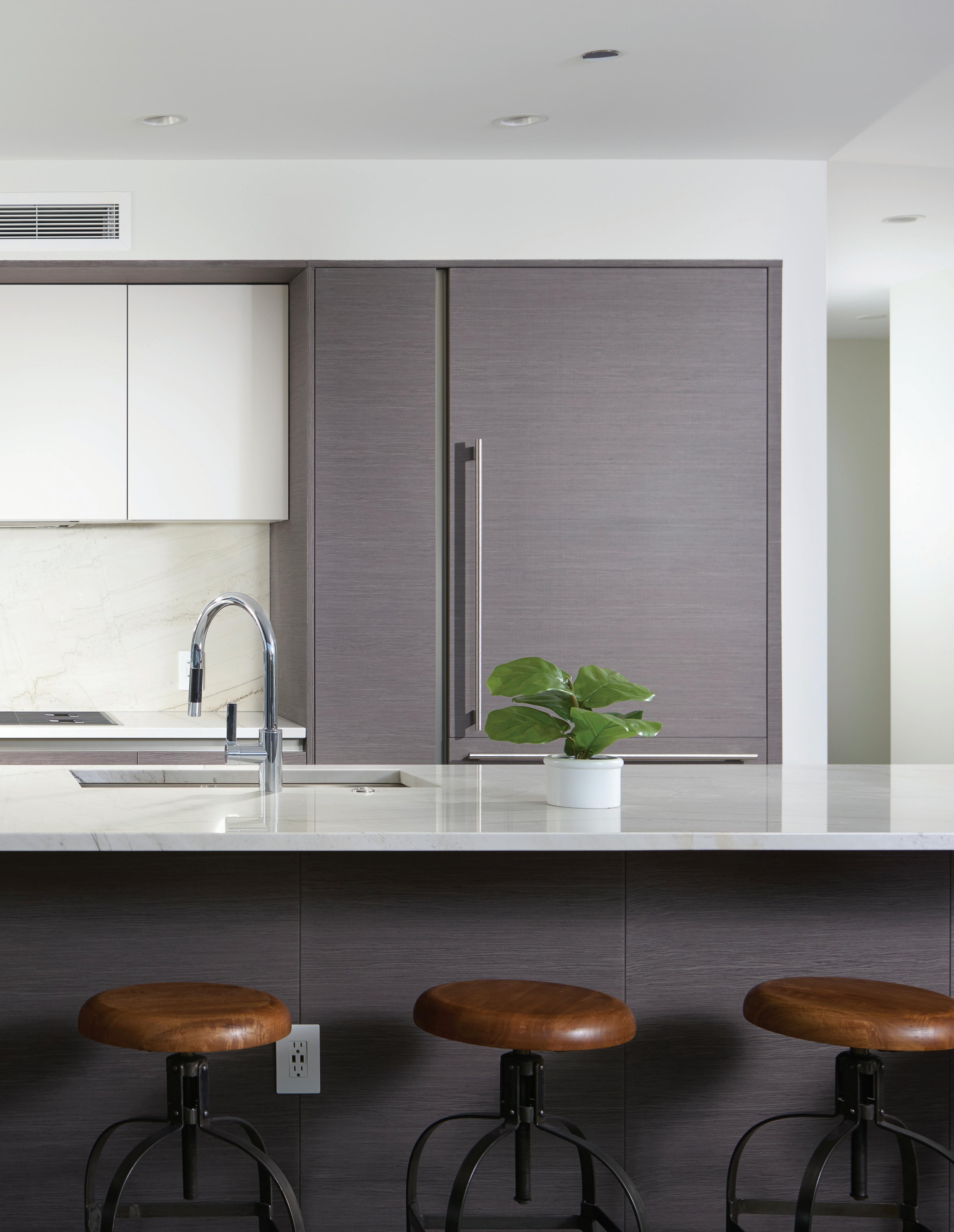 ARMAZEM CABINETRY, OVERSIZED QUARTZITE ISLAND, BUILT-IN WINE FRIDGE, AND DORNBACHT FIXTURES.