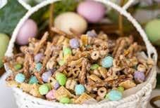 This is such a fun recipe for an easy but yummy Easter treat. Line a cookie sheet with parchment paper and set aside. Grab a bowl and pour in your Chex Mix, Cheerios and Pretzels (we used the sticks but the mini pretzels would be fun too), and set aside.