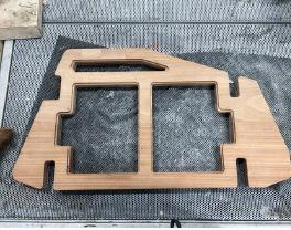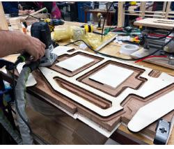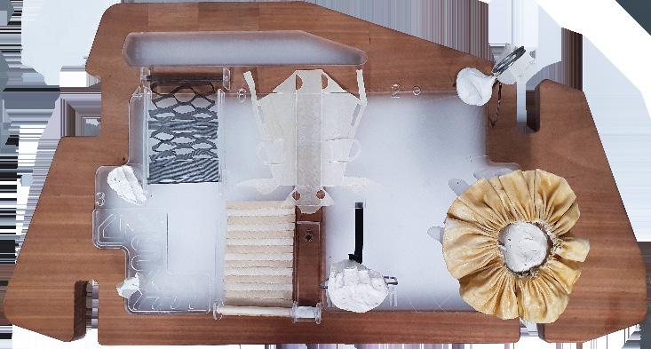 A board to hold the objects was also designed so it would naturally position viewers to face the Clothworker’s Study. The frosted acrylic windows would allow light from the funnels and cast shadows. It was first sanded, laminated, then stained to achieve a smooth finish.