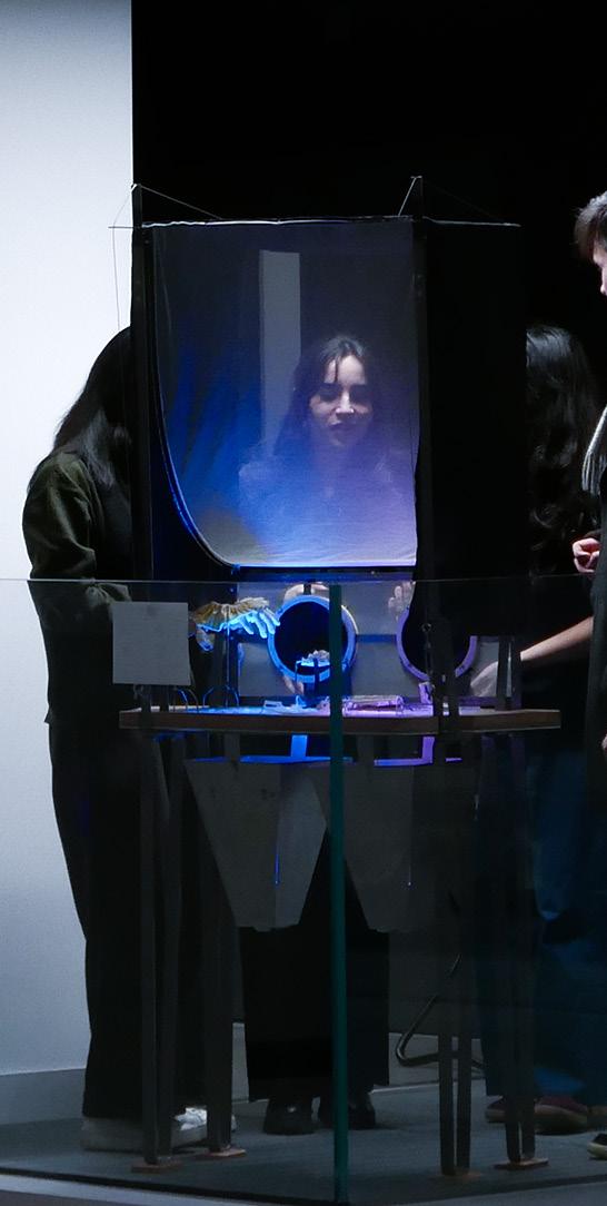 The final piece was a device to look near and far, inviting visitors to reach in to gloves and explore foreign objects. This would cast shadows onto a translucent screen positioned to directly view the workshop, allowing viewers to observe the fabric workers while creating captivating visuals through replicating their movements.