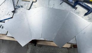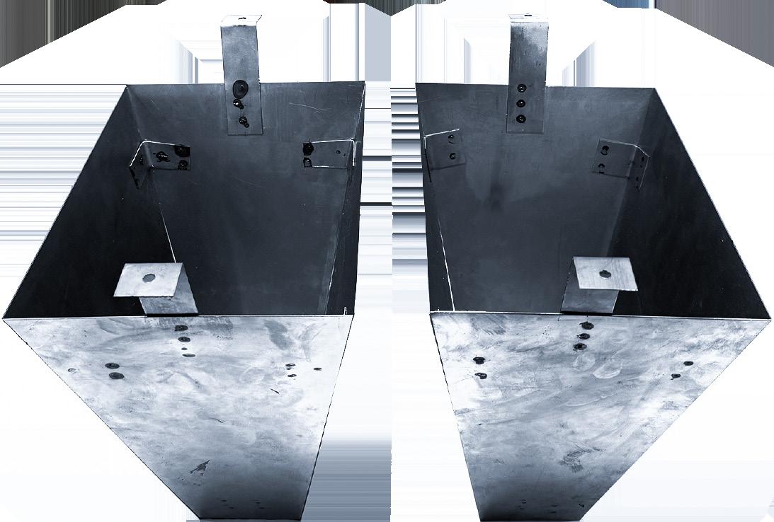 I first created cardboard and tinfoil mockups to test the strength of light. Then, steel sheets were cut out and joined with dowels spot welded in the corners. Finally, the tabs on the side of the light holders are bolted to a steel frame.