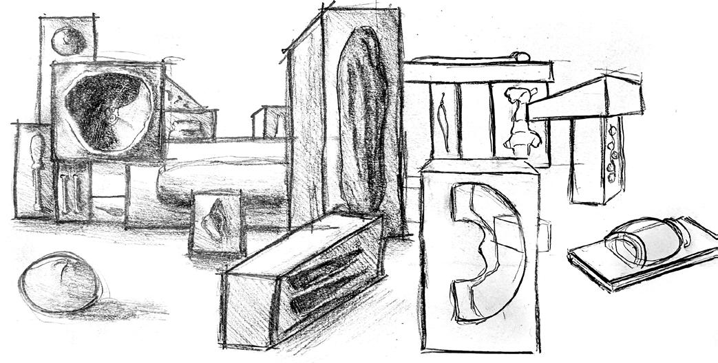 I reassembled the old radio, sprayed it in white paint to abstract the forms, and opened up the possibility of creative reimagination. I subsequently created a dense, atmospheric cityscape, and then traced over the images, pondering how inhabitants would feel: either peaceful or claustrophobic.