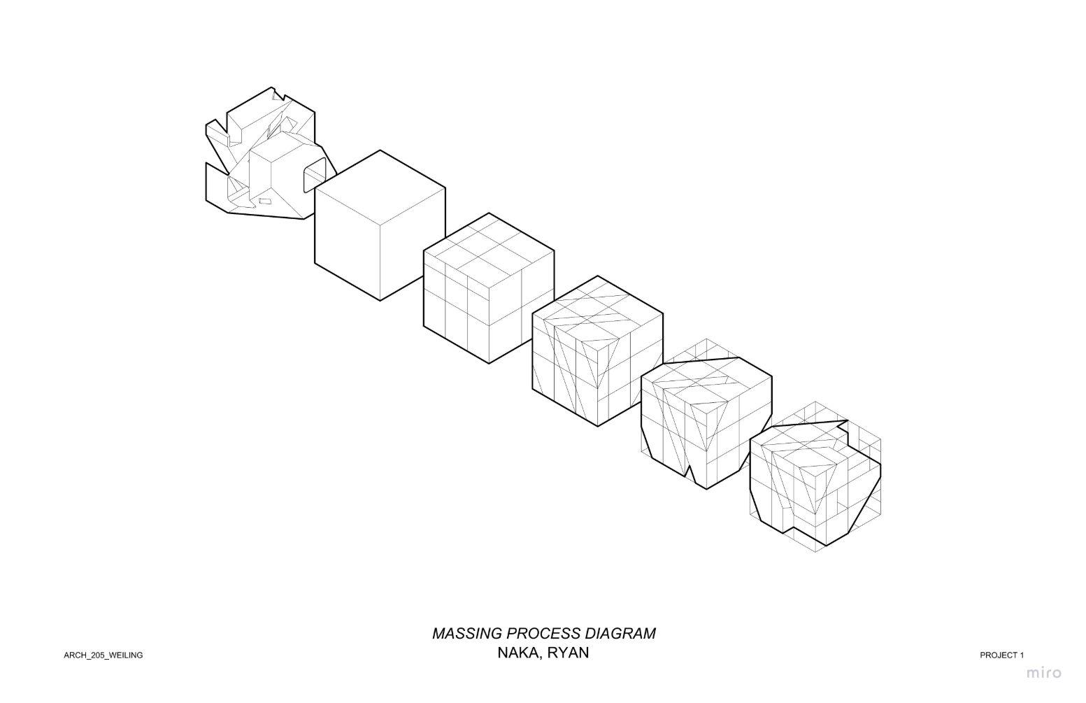 The assignment was to create a cube using the concept of 3-2-1 intersections. The cube began as a grid that was rotated. The intersection points of the grid were used to create triangular cuts that resulted in interior space.