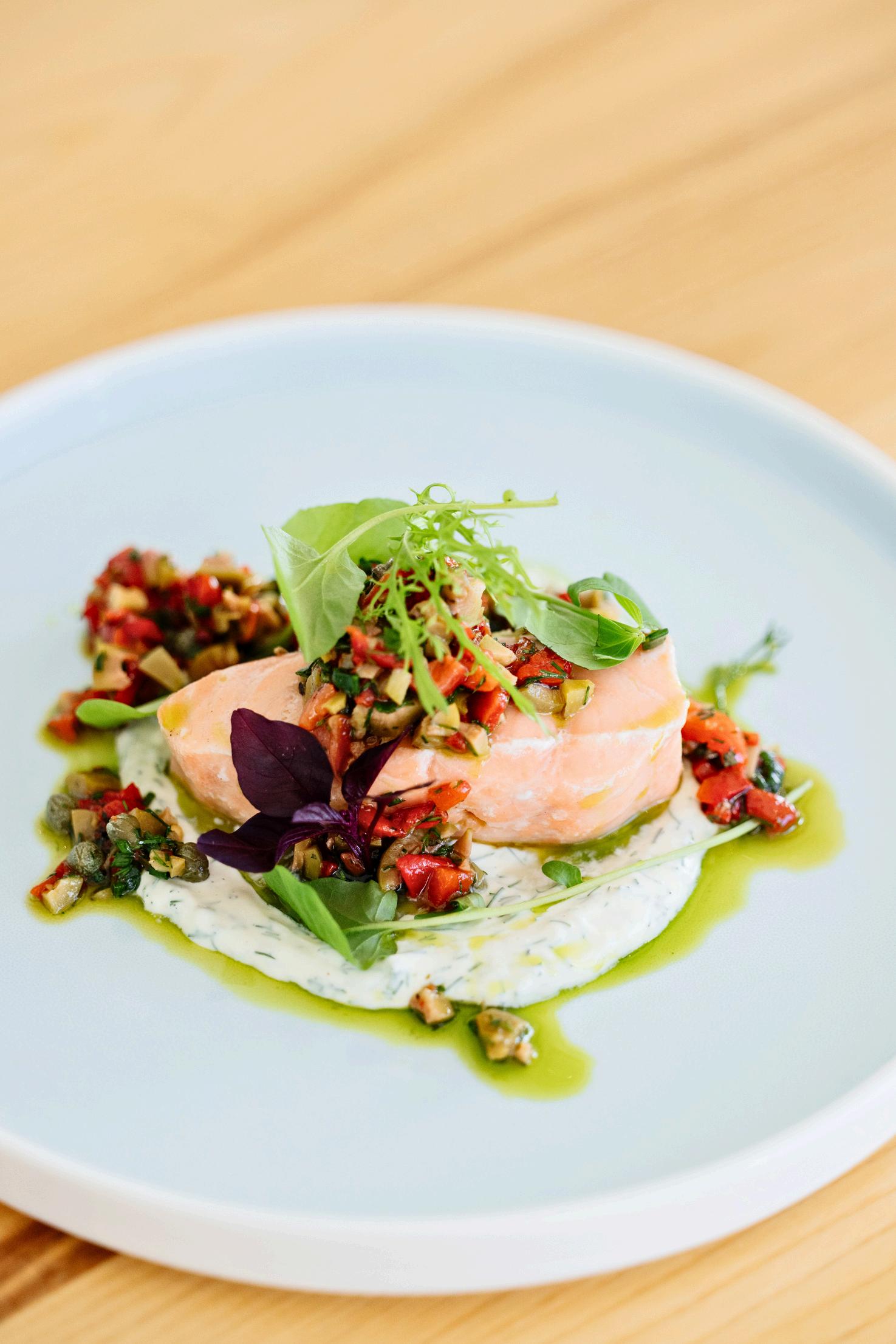 Wild fennel and yuzu cured salmon, pickled fennel, orange and caper chive crème fraiche