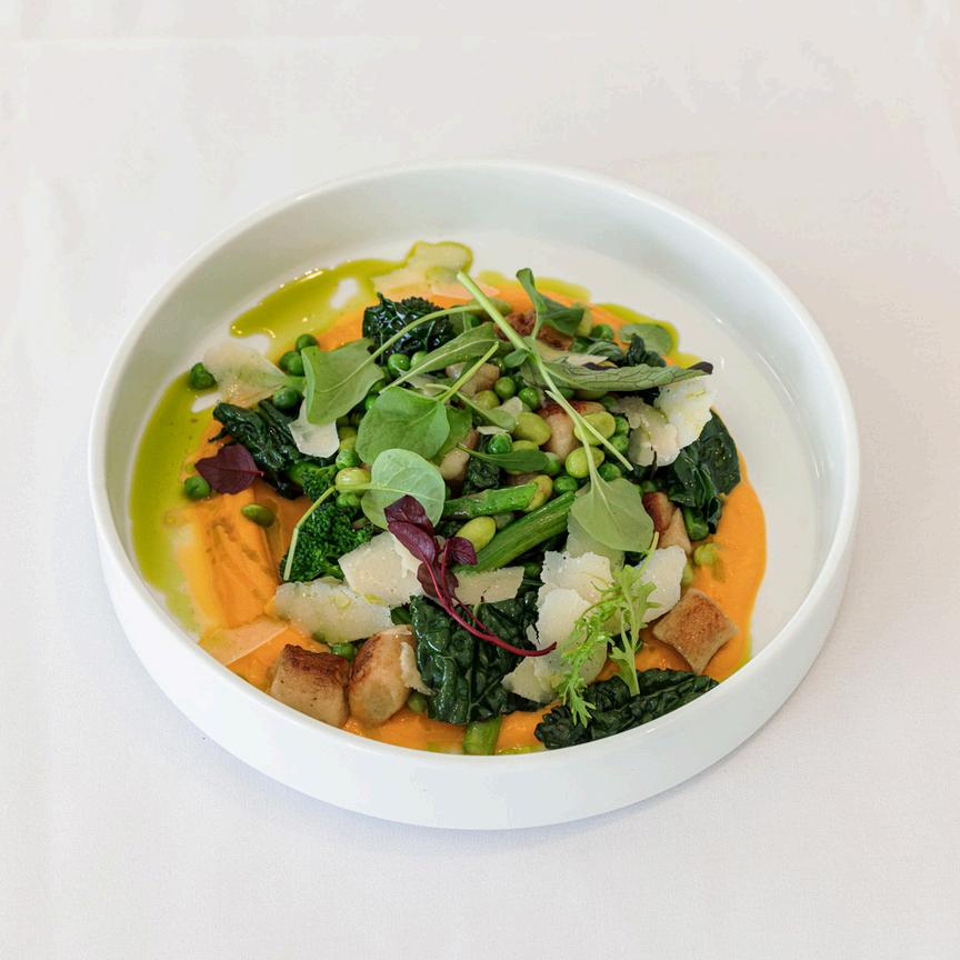 Tandoori cauliflower with coconut pumpkin puree, almonds and broccollini