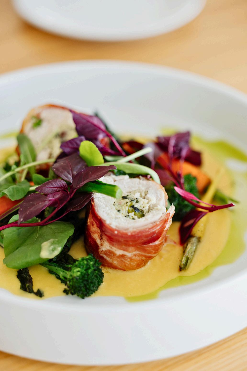 Chicken ricotta and pistachio roulade with creamed pumpkin, seasonal greens and salsa verde