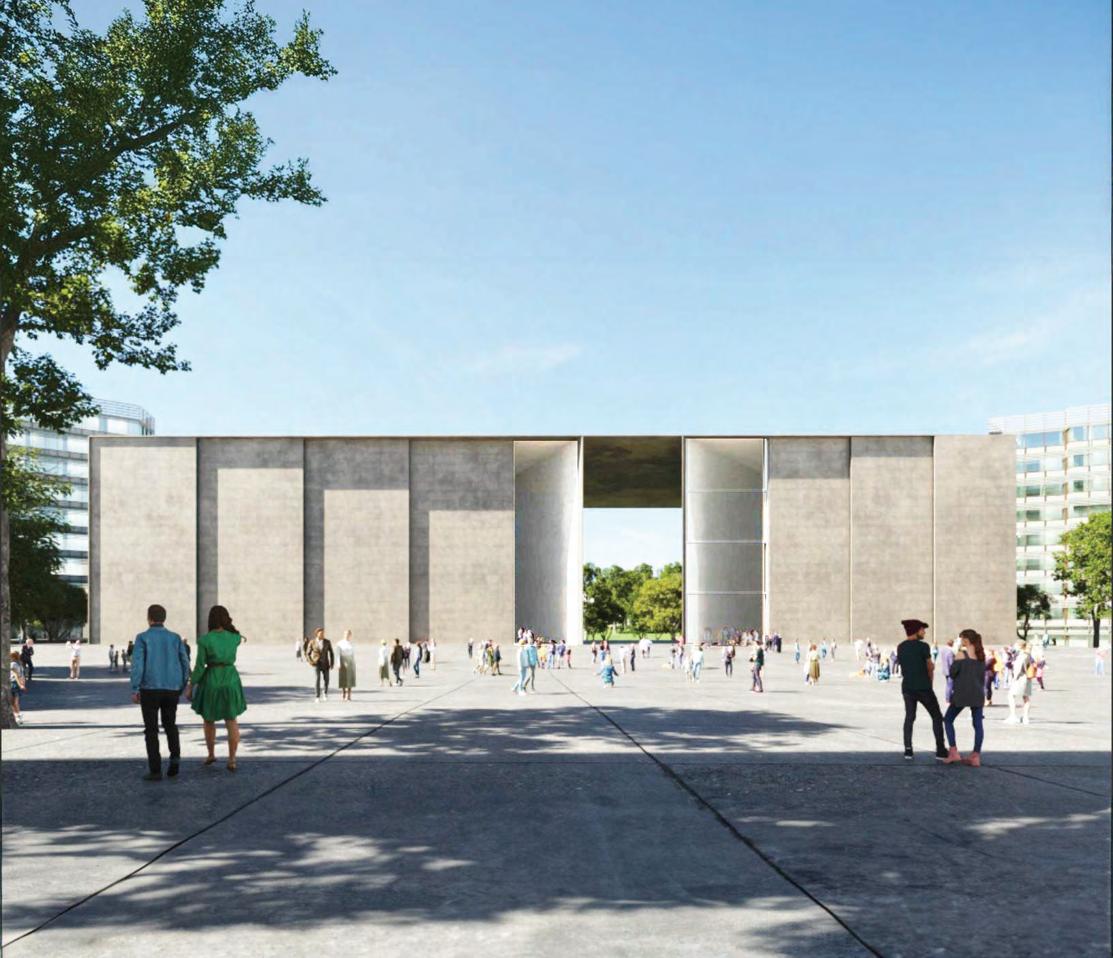 Un gran gesto arquitectónico, dos planos que se despegan, genera una puerta urbana que sirve de acceso al Museo y al parque, abriendo la posibilidad de establecer una conexión fisica y visual con el Rio. El gran vacío urbano generado permite la organización de exposiciones y eventos al aire libre.