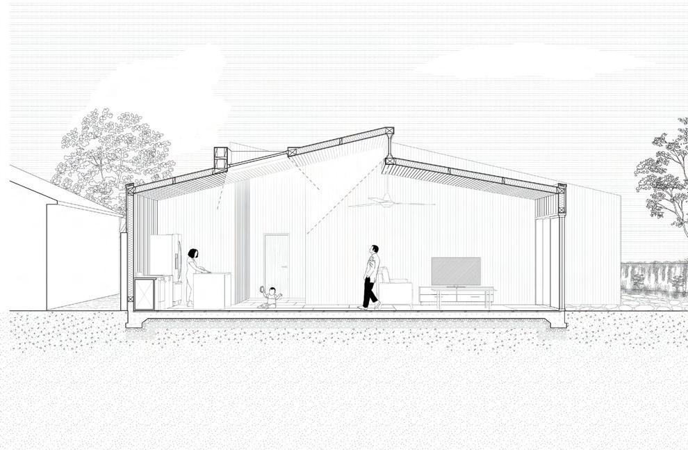Both dwellings are tailored to their occupants: a Belgian couple in the north dwelling and an Australian family with a newborn in the south. The design emphasizes passive cooling, natural light, and privacy while fostering a sense of community under a continuous, unifying roof — aptly named “Een Dak House” (One Roof House). This concept celebrates cultural unity and shared living while maintaining individual identity.
