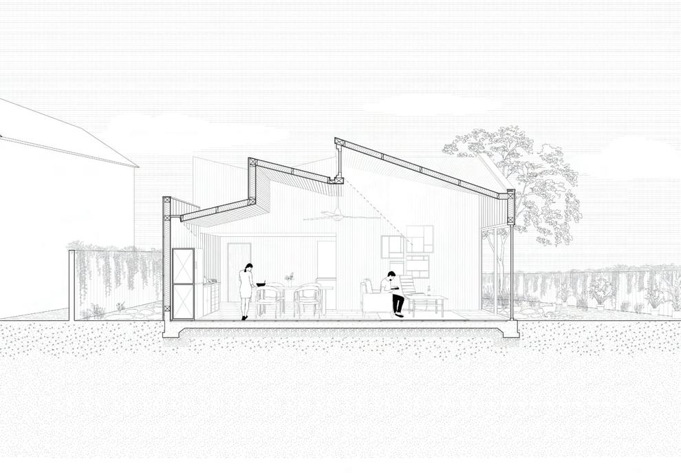 The original design of the Right Angle House was built for Vilches’ temperate climate, with cool conditions and large forests. However, it suits the new location in Dalkeith, Perth as the site is located beside the riverbank, where cool sea breezes are constantly blowing past the house. I added clerestory windows in the North-facing entrance of the house for cross-ventilation, and refurbished the protuding skylights to also act as ‘wind catchers’.