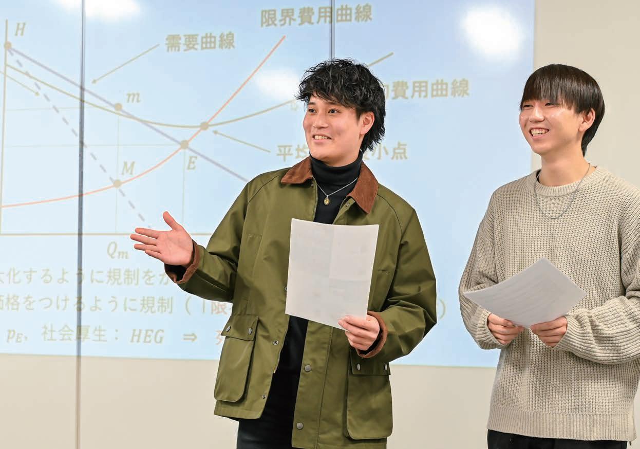 た行動は、「人間は損失局面でリスク愛好的になる」と考えます。「失 敗すればより損失は大きくなるが、うまくいけば損失をなかったこと にできる」と思い、無謀な行動を取ってしまうのです。社会は人間のさ まざまな選択と意思決定で成り立っています。そうした意思決定の原 理・理論についての学びは、社会が抱える課題の学びと密接に結びつ いています。私はこの学びを経験し、自分自身の選択、意思決定につい てより深く考える機会が増えました。学問的な成長だけでなく、人間 的にも成長するきっかけになったと感じています。