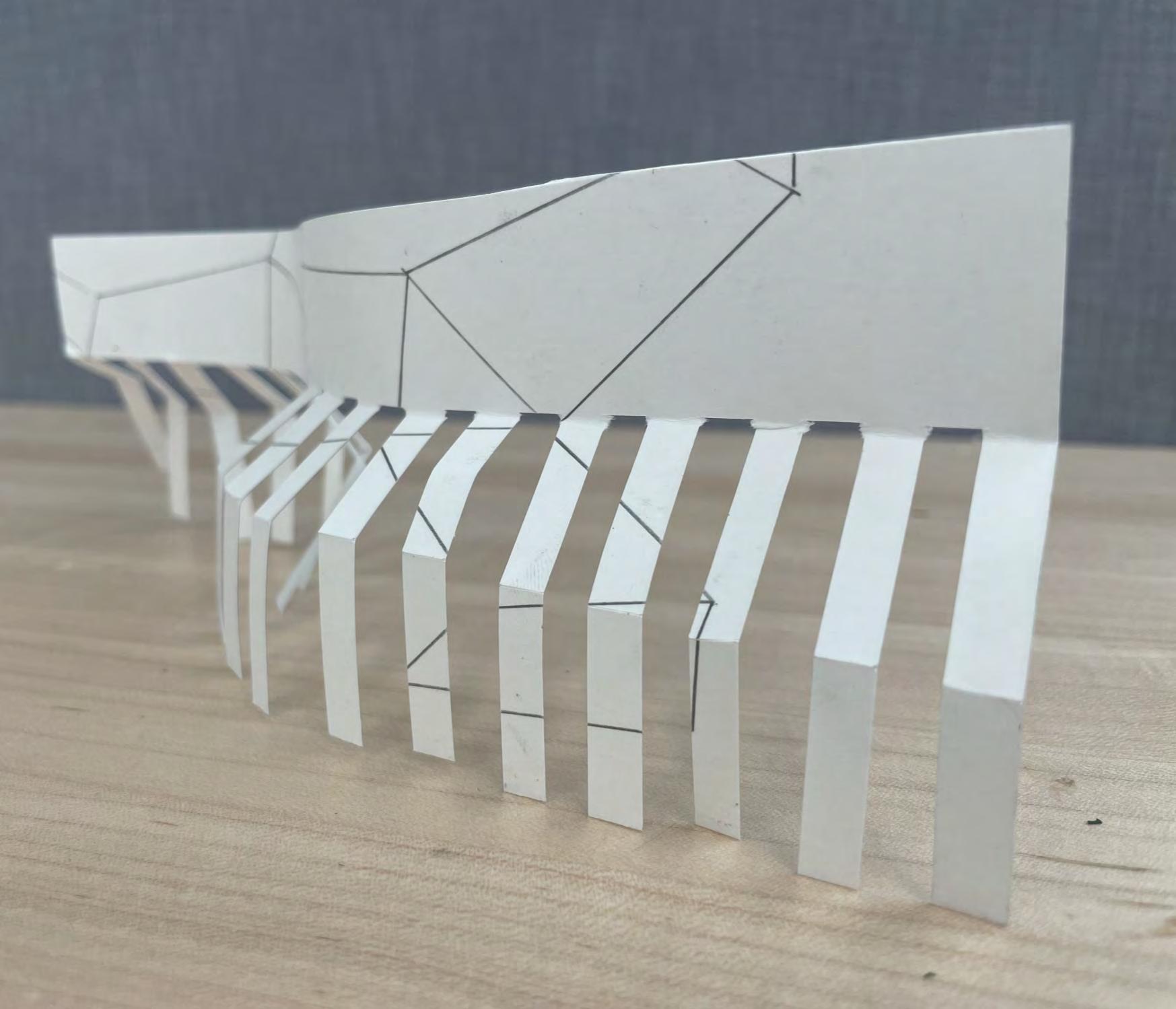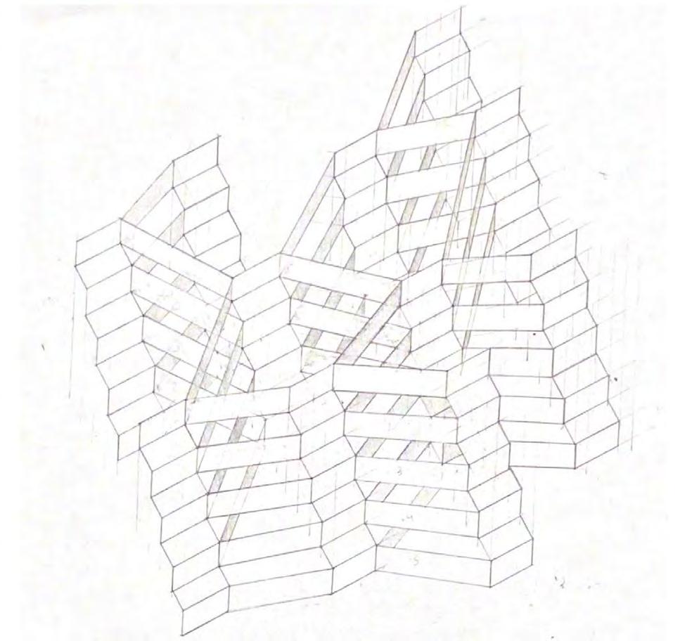 Frommypreviousmodel,Iextractedthis“s”shapethat is a prominent shape in the model. I started to diagram ideas for roofing, walls, and how I could start creating spacethatcouldbecomehabitable.Inadditiontothis,I startedtoreallythinkaboutstructureintermsofhowthe wallsandroofingwouldsupportitselfinrelationtoeach other.