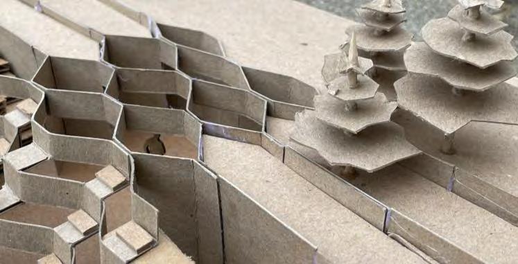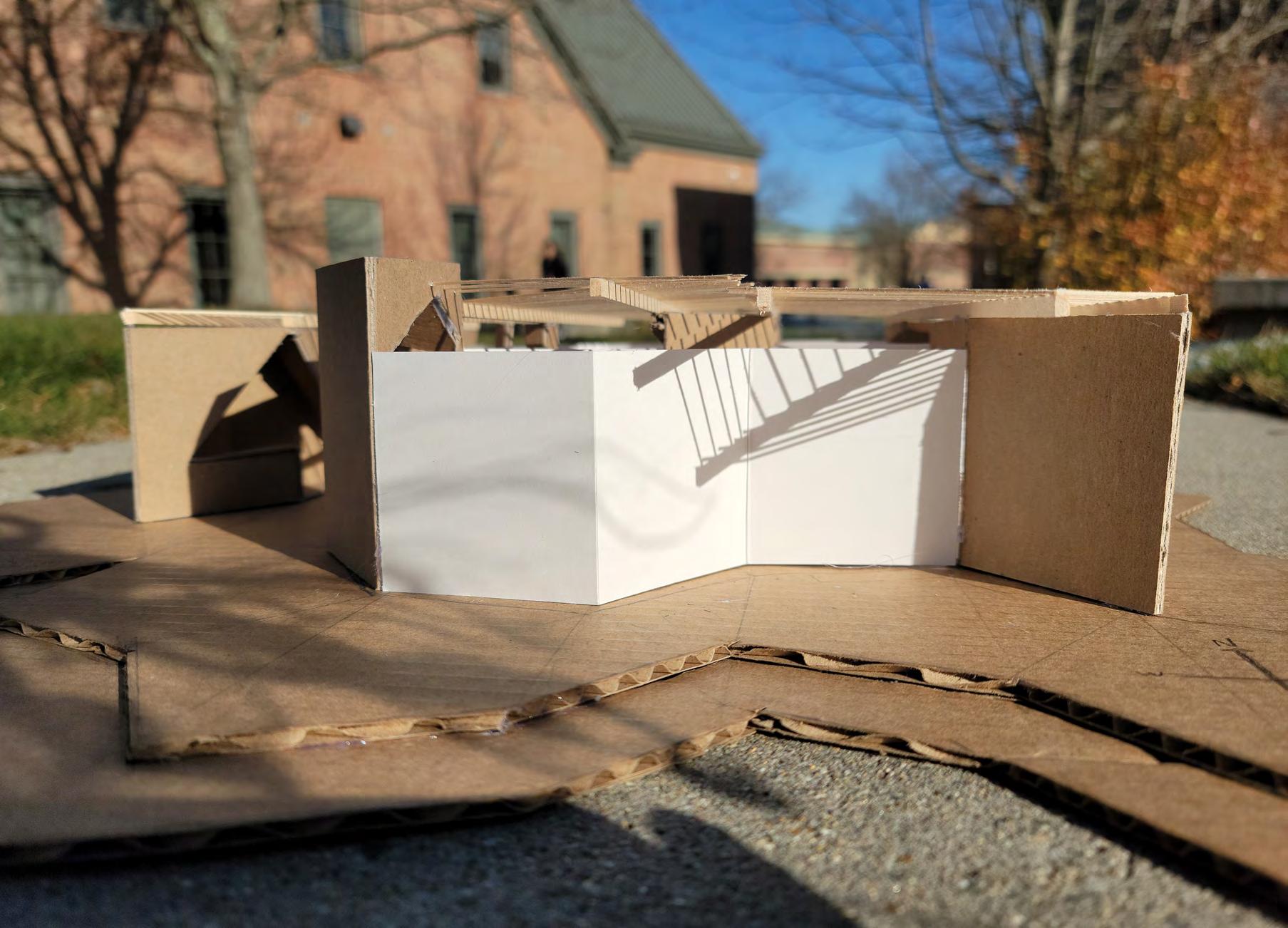 The final step in this project was to build the pavilion at a 1/4th scale. This included everything that was on the site plan and fleshed out materials that would be used in the pavilion. This model is made mostly out of foamcore but there are also chipboard, wood, paint strip, and foil elements that switch up the color and feel of the building.