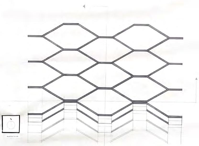One key parti concept that was carried throughout my design was the “s” shape that was originally extracted from my model from part two of the project. A second key parti concept that was important in my final design was the idea of having different heights. The differing heights was first portrayed in my section drawing of the vessel and in the final model for part two.While trying to think about structure and how the walls and roofing could potentially work in my final design for the pavilion, I eliminated the idea of having topographythatwasinmysecondmodel.Instead,Imadethecolumnsdifferentheightswithinthefinalmodel.Thedifferingheightsled to the creation of an interesting roof design.The design of the roof was greatly influenced by the vertical columns.An important part of myroofdesignwasthecentralaxisthatranallthewayacross.Itranbetweenthecolumnsofbothspacesandunitedtheentirestructure. I believe that a strength that is present in my design is the overall structure. It is very structurally sound, and someone would be able to easily understand how it works. There are vertical members (the columns) that support the horizontal members ( the beams) that run across from one column to the other.An area that could be strengthened in my final design would be the circulation. The circulation of thespaceissomewhatawkwardinthatapersonwouldhavetowalkaroundapartofthebuildinginordertogettothesecondunitofthe pavilion. If I had more time I would work on trying to create a space that flows better with improved circulation within the space. Originally the two main spaces were pulled apart, so there was a pathway that connected the two. But, as I further developed the pavilion I pushed the two units together, eliminating the space in between, and the pathway connecting them.The reason why I did that at the time was because I felt as though it was awkward to have this pathway in the middle that cut right through the two spaces, as it disruptedtheflowofthedesignthatisveryapparentinplan.Overall,Ibelievethatmydrawingandmodelmakingskillshaveimproved overthecourseofthesemesterandI’mlookingforwardtocontinuedevelopingasastudent.