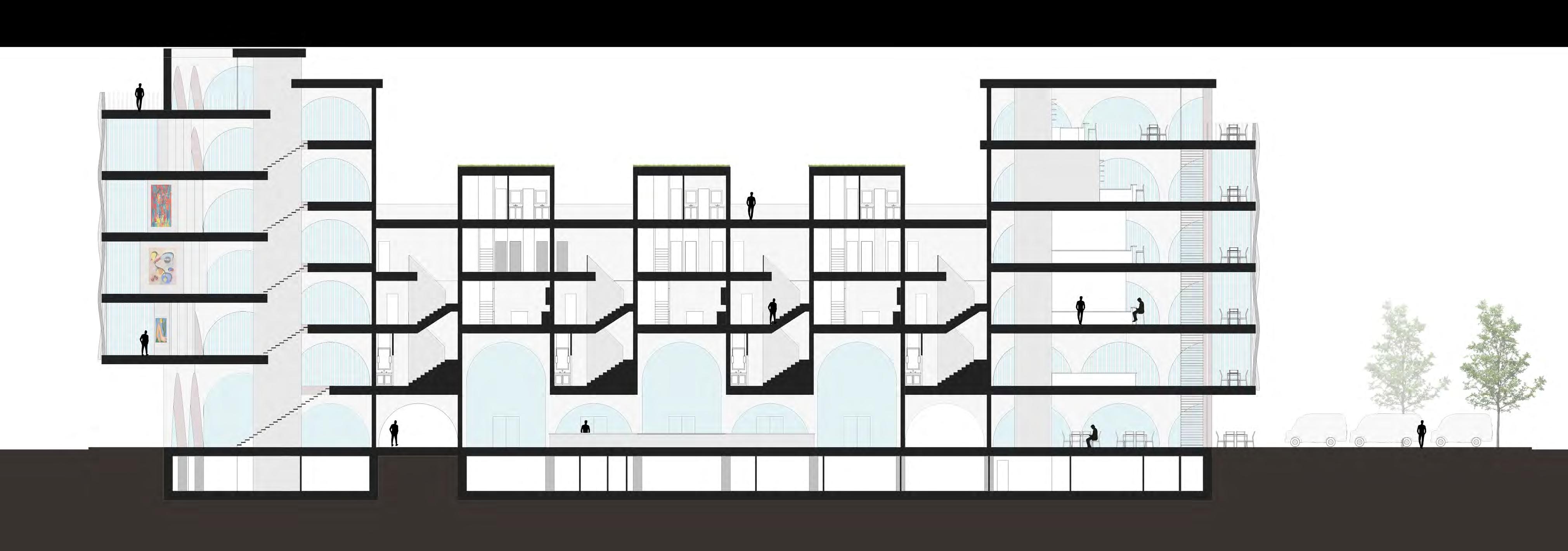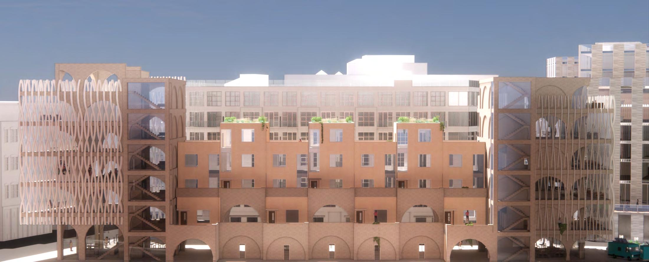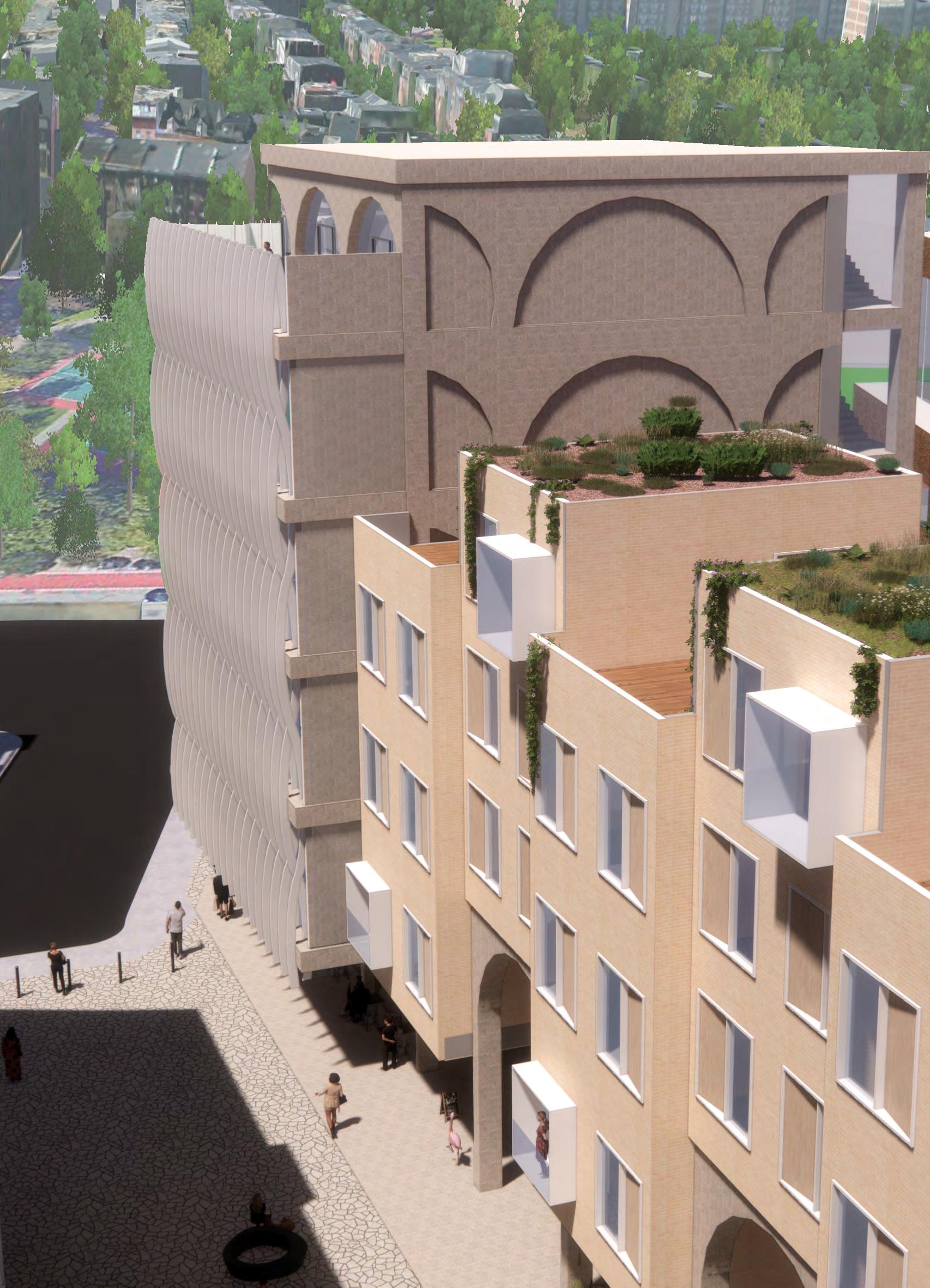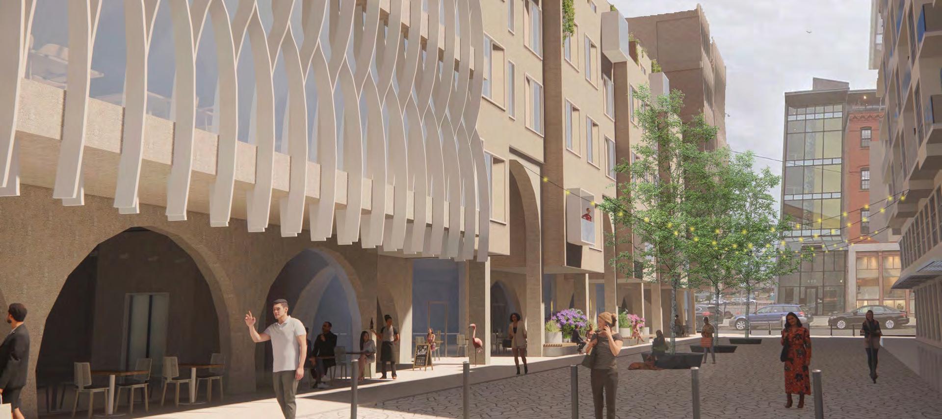 The bookend buildings feature a modern glassy facade. These more sculptural buildings speak to the community and illustrate their welcoming program. Raised in the center are townhouses with a more solid facade relating to the classic south end townhouse typology. The townhouses in my design are up-scale single family dwellings, each with 3 bedrooms. These are designed to help pay for the community program. Facing the park is an expansive market and restaurant building. Under the townhouses is a mix of the market and art space with an artisan market for different artists, chefs, and bakers. Facing SOWA is a large gallery building to strengthen the arts district. The facade treatment and structure attempt to accomplish an array of tasks. The arched structure recalls the docks that filled the area before the South End was filled in. These symbolize a connection or bridging of cultures. The openness and warmth they provide on the ground floor creates a welcoming facade. The sculptural fins aim the views from the bookend buildings, while reflecting light inside, as well as reflecting light back down into the woonerf and laconia path. The light brick treatment of the townhouses references the brick townhouses of the area while still reflecting light.