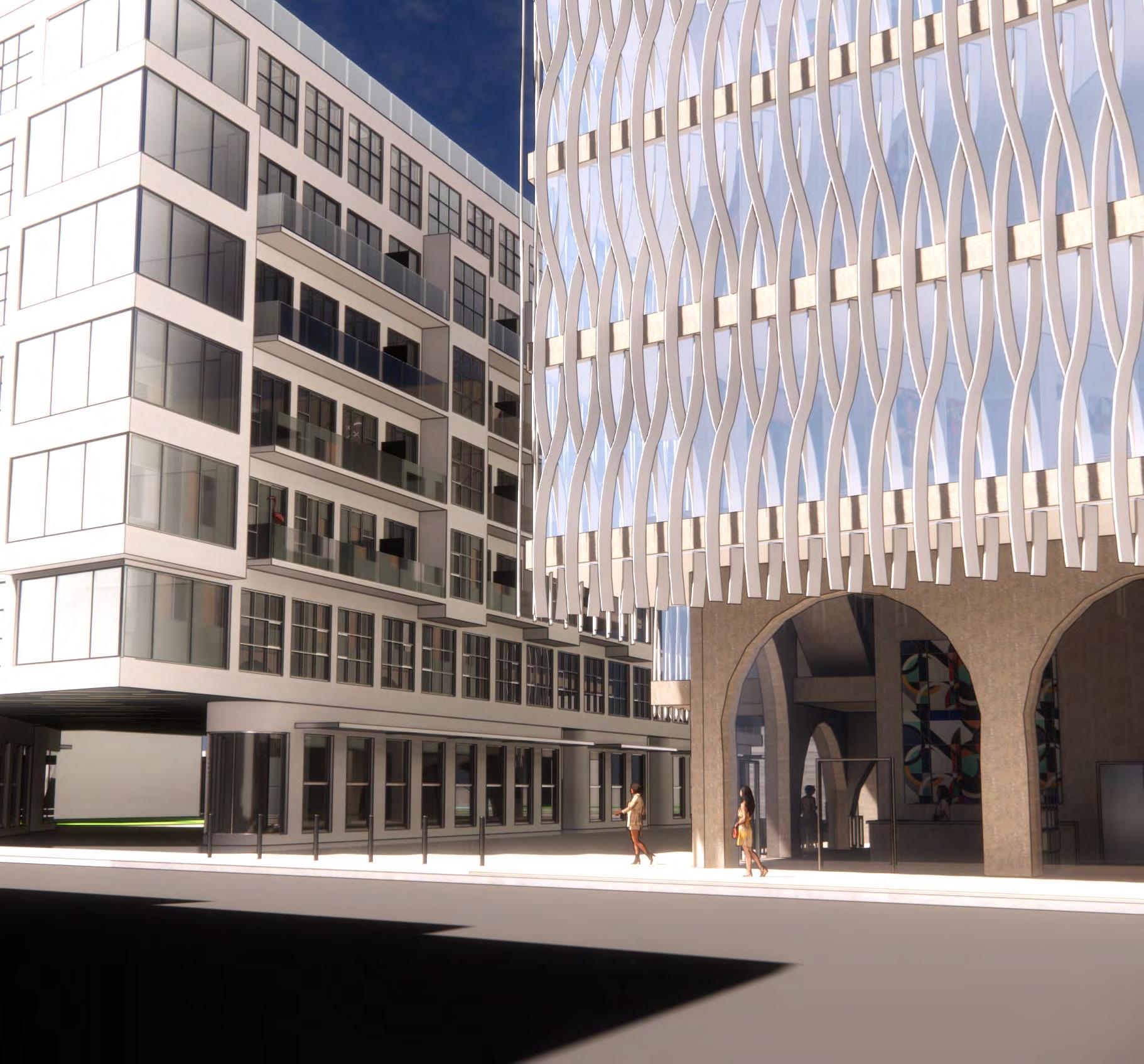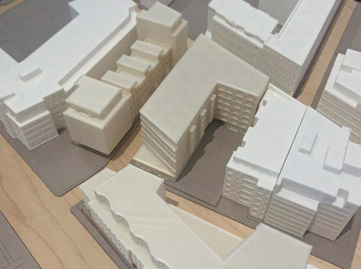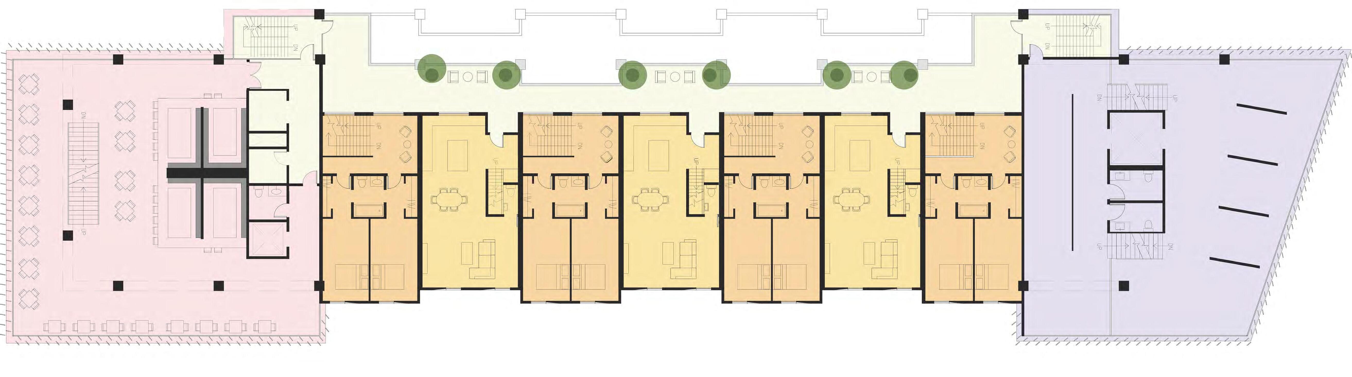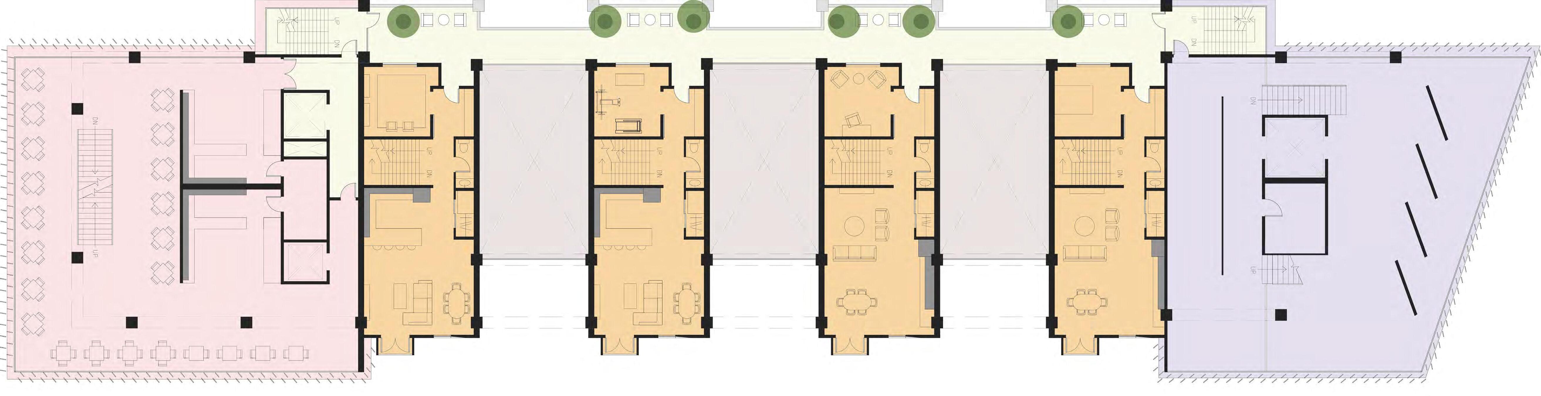 The bookend buildings feature a modern glassy facade. These more sculptural buildings speak to the community and illustrate their welcoming program. Raised in the center are townhouses with a more solid facade relating to the classic south end townhouse typology. The townhouses in my design are up-scale single family dwellings, each with 3 bedrooms. These are designed to help pay for the community program. Facing the park is an expansive market and restaurant building. Under the townhouses is a mix of the market and art space with an artisan market for different artists, chefs, and bakers. Facing SOWA is a large gallery building to strengthen the arts district. The facade treatment and structure attempt to accomplish an array of tasks. The arched structure recalls the docks that filled the area before the South End was filled in. These symbolize a connection or bridging of cultures. The openness and warmth they provide on the ground floor creates a welcoming facade. The sculptural fins aim the views from the bookend buildings, while reflecting light inside, as well as reflecting light back down into the woonerf and laconia path. The light brick treatment of the townhouses references the brick townhouses of the area while still reflecting light.