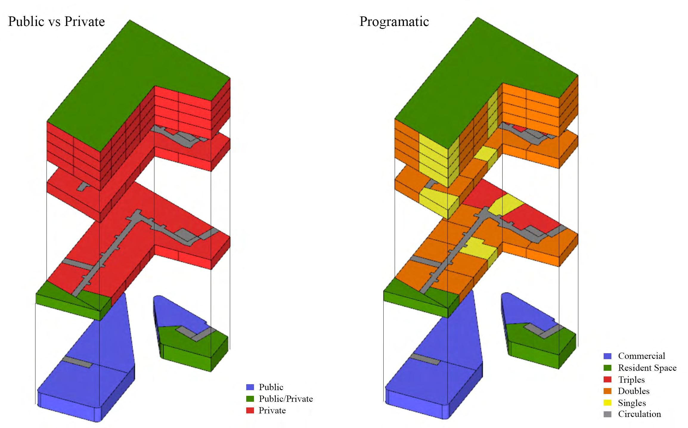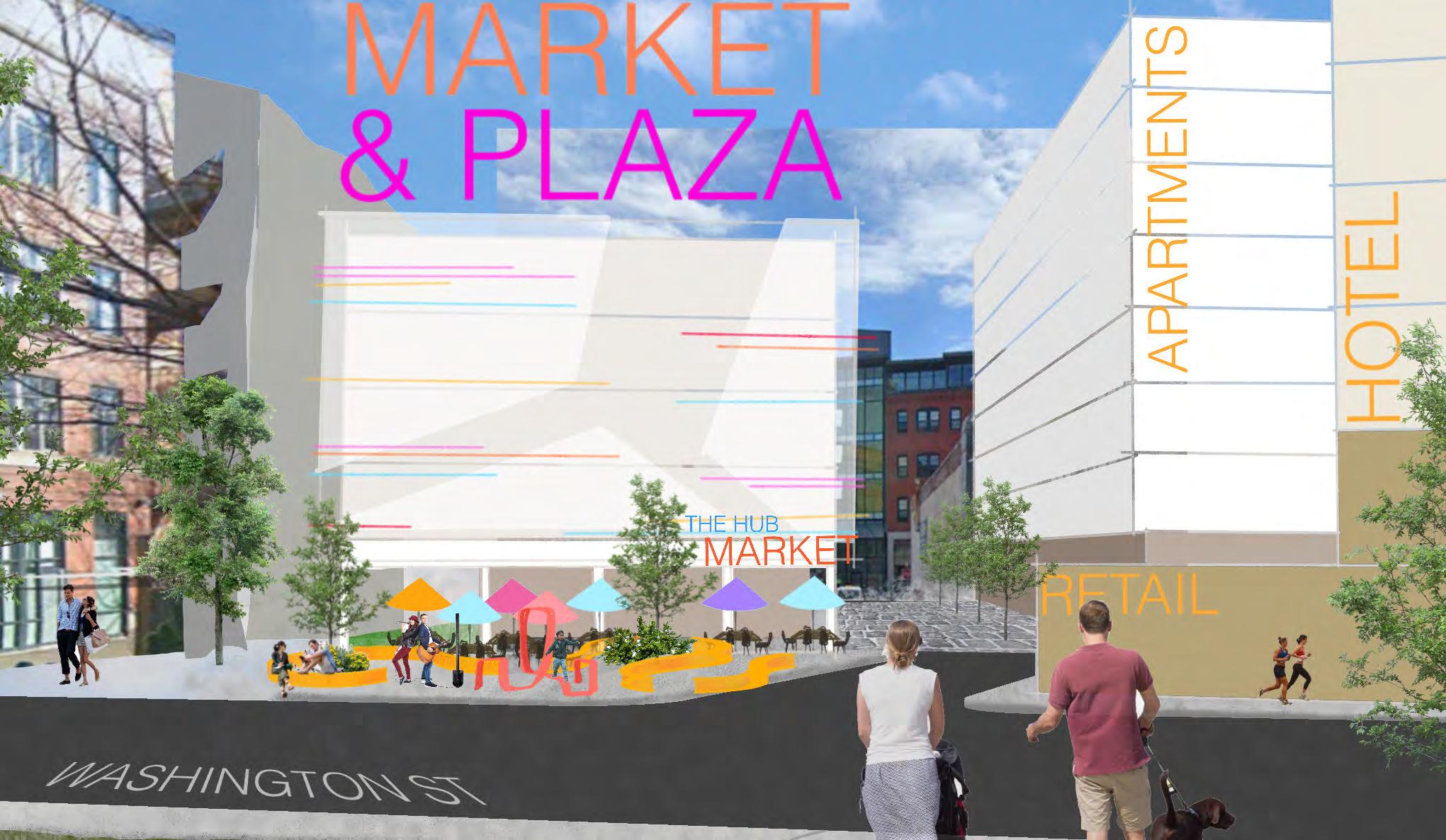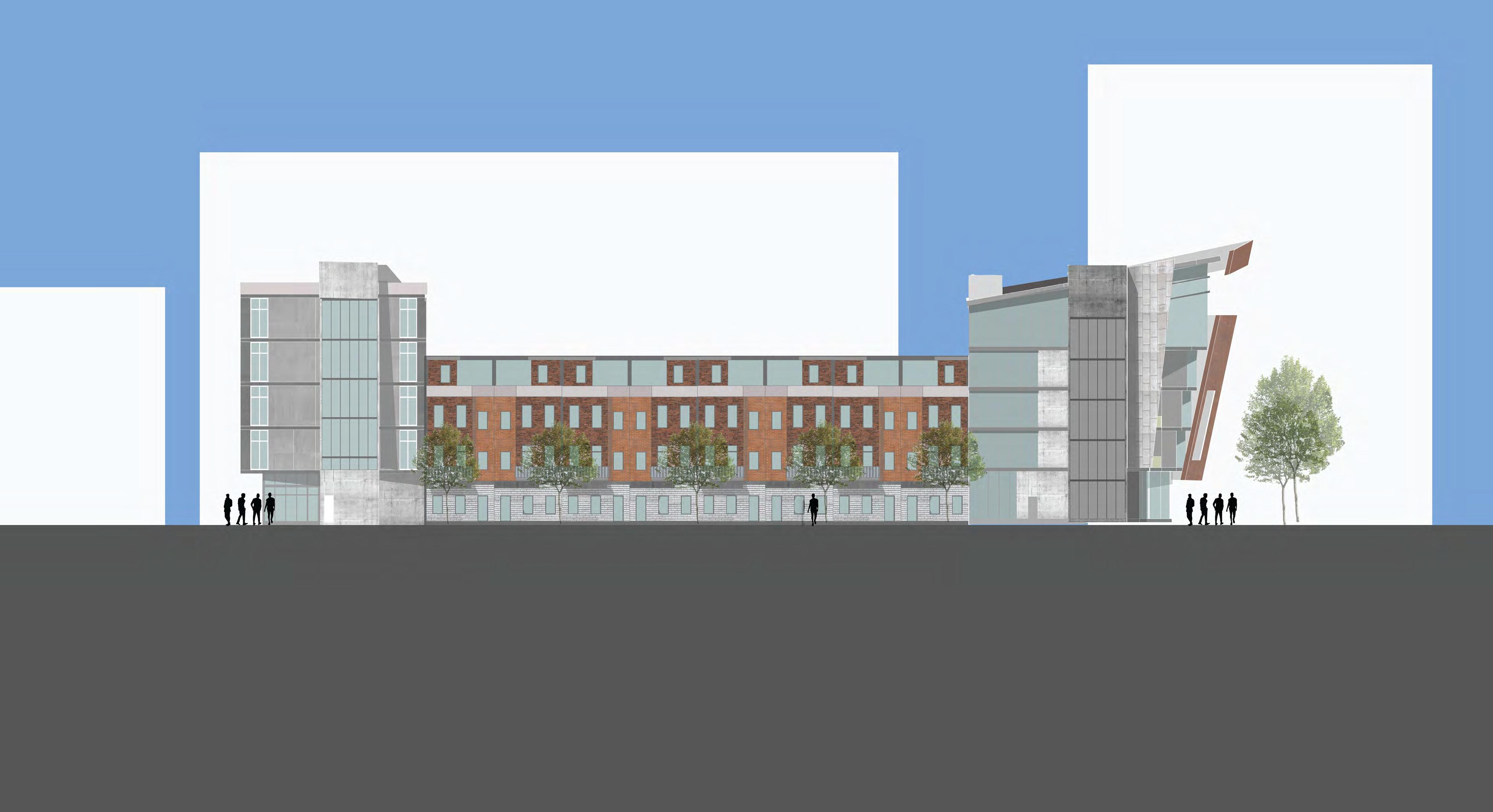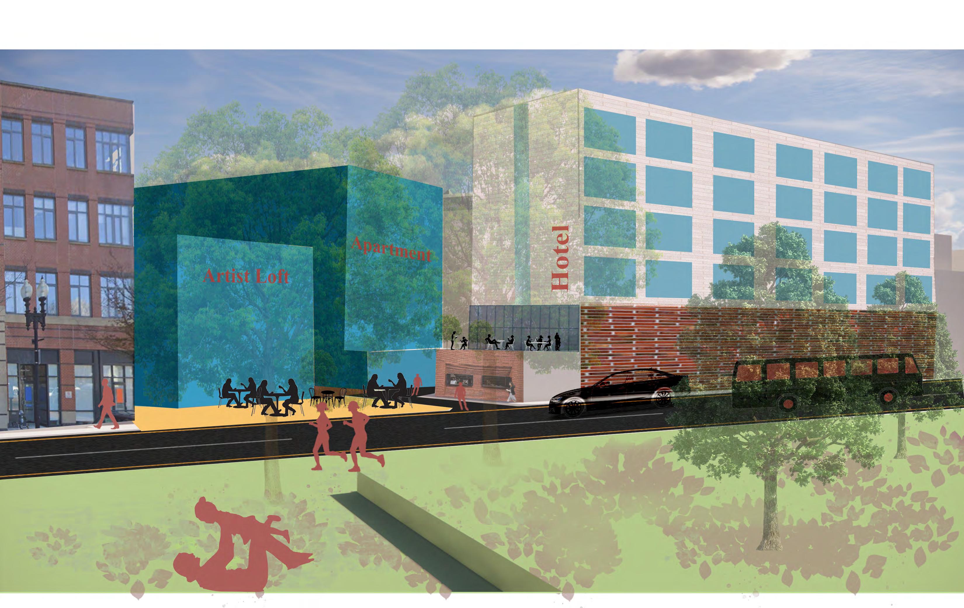 The Hub on Perry St aims to weave the different cultures of the south end together in one community oriented space. More directly, the site provides for the adjacent park, as well as the proposed townhouses, apartments, and hotel. The building is organized with an open first floor plan full of public space, as well as two bookend buildings that serve the community.