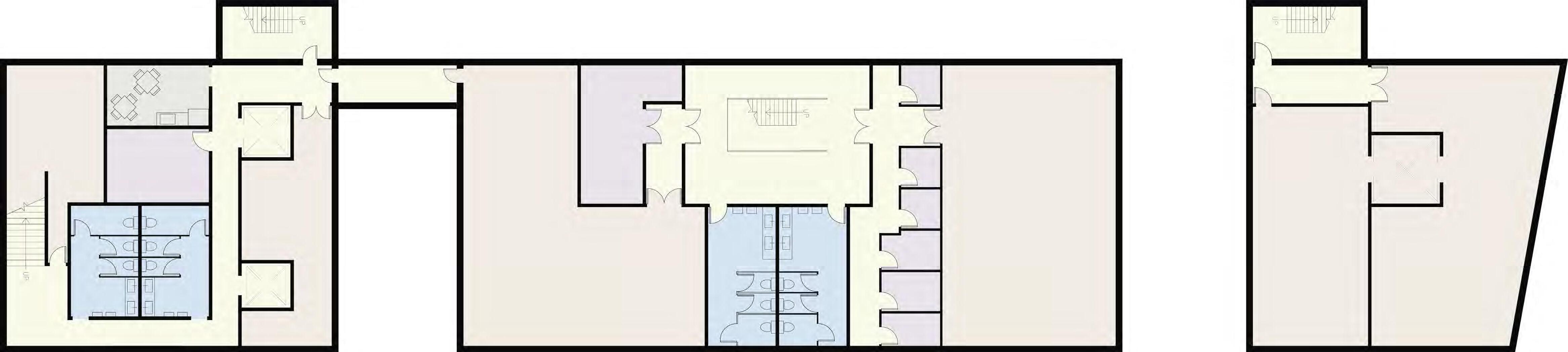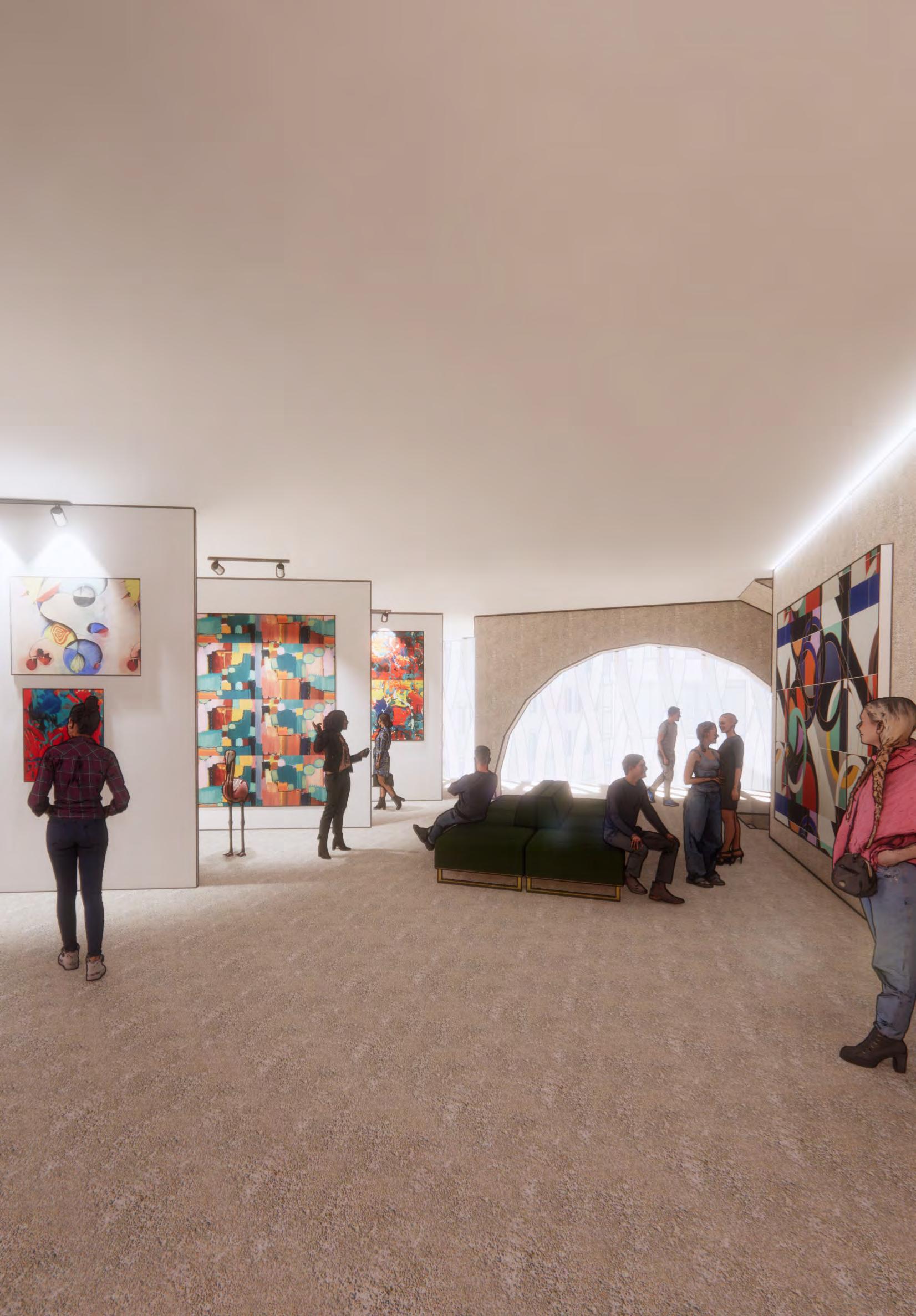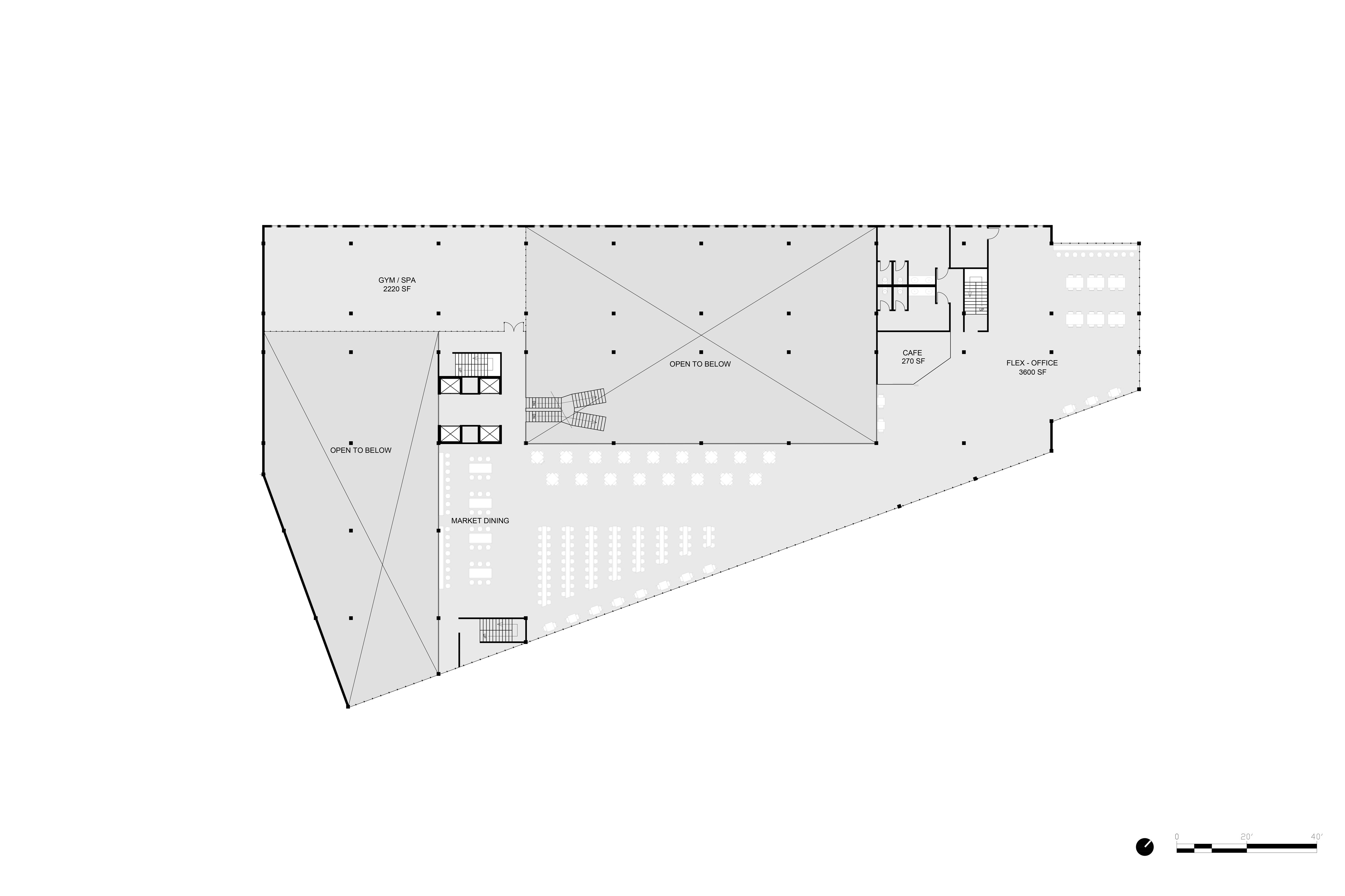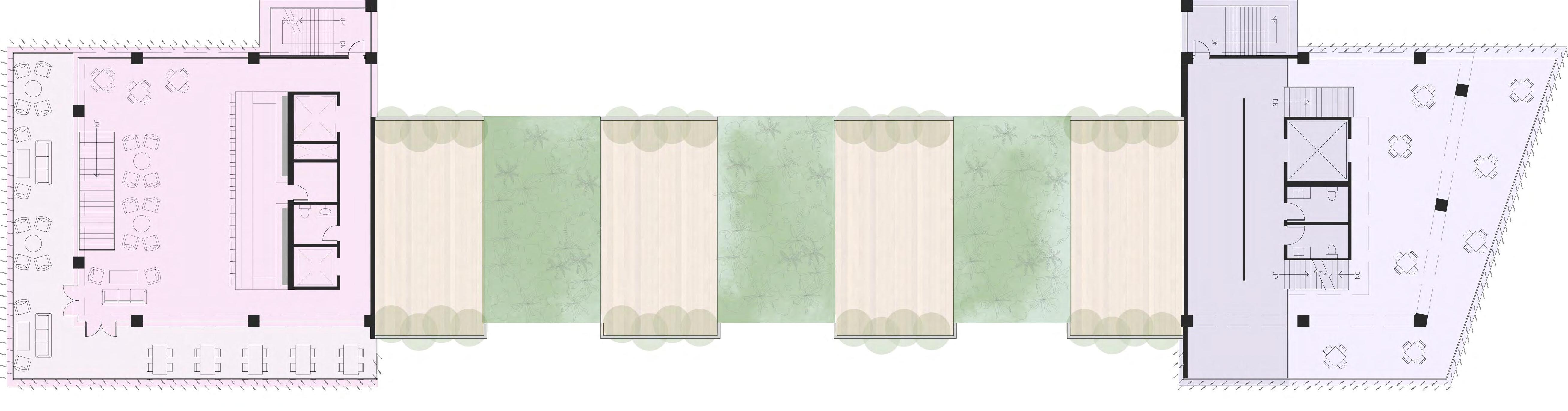MARKET AS WELL AS THE HOTEL LOBBY AND LOUNGE. IN TODAYS WORLD WORKING FROM HOME IS ESSENTIAL, SPACES ON THE SECOND LEVEL WERE CREATED TO MOCK CAFE SYTLE WORK FROM HOME CONDITIONS. THEY ARE OPEN TO THE PUBLIC AND ALLOW HOTEL GUESTS A DESIGNATED PLACE FOR WORK OUTSIDE OF THEIR HOTEL ROOM TO FOSTER A BETTER WORK-LIFE BALANCE.