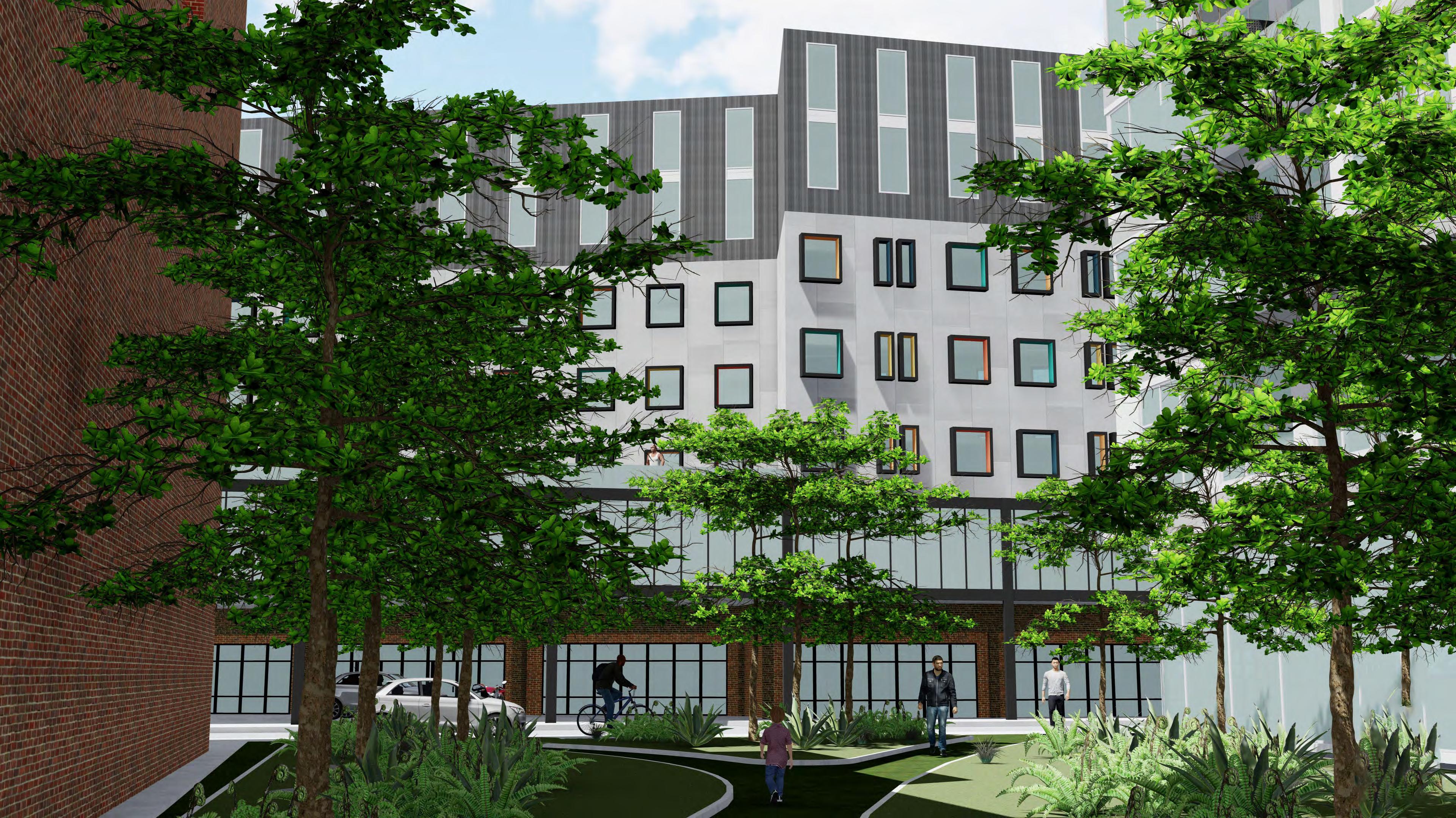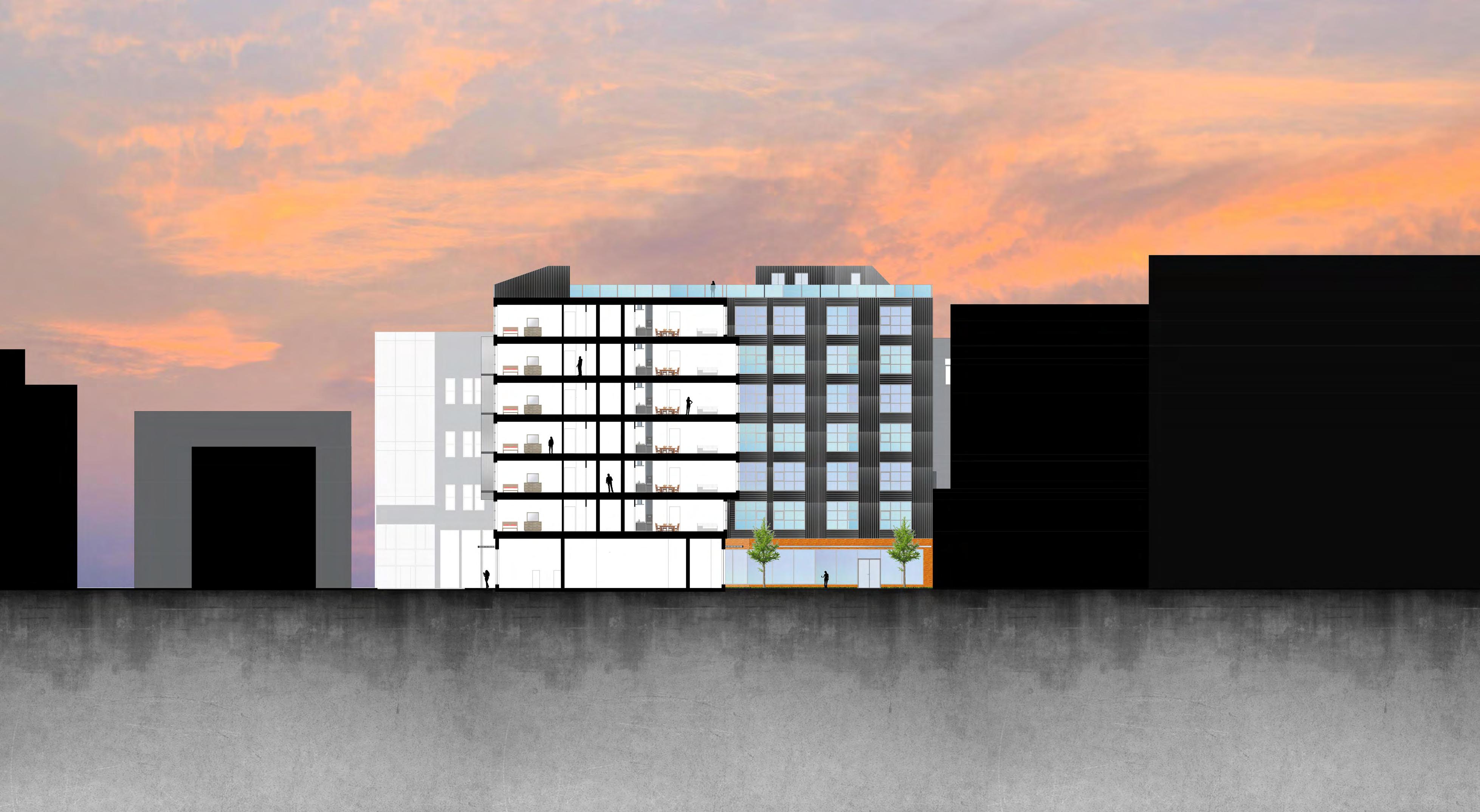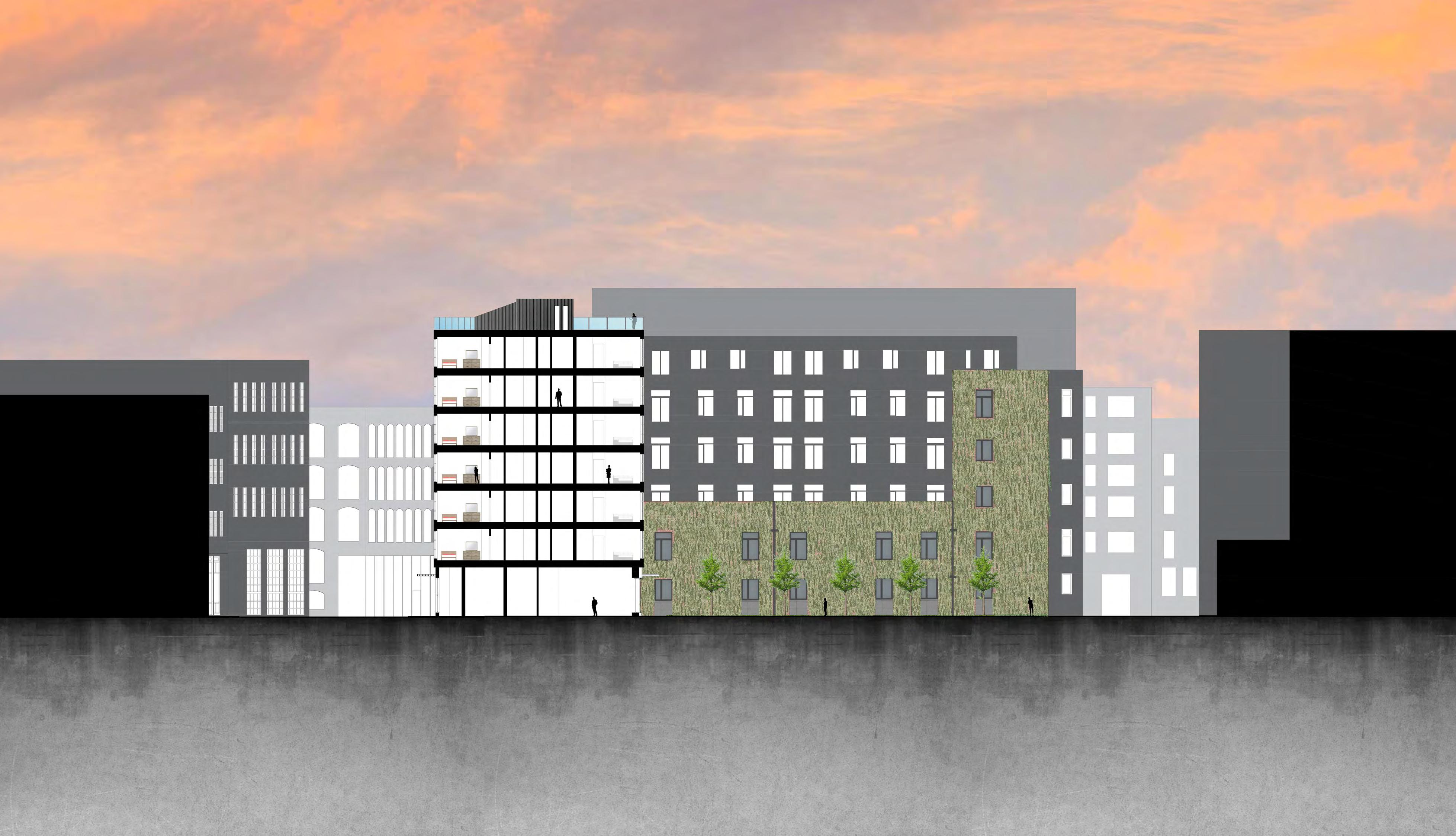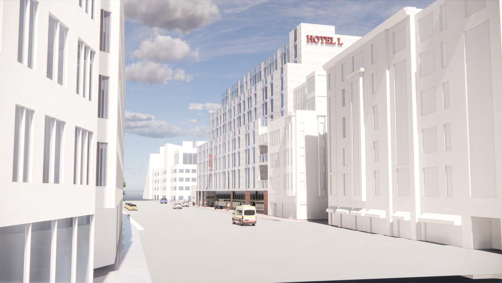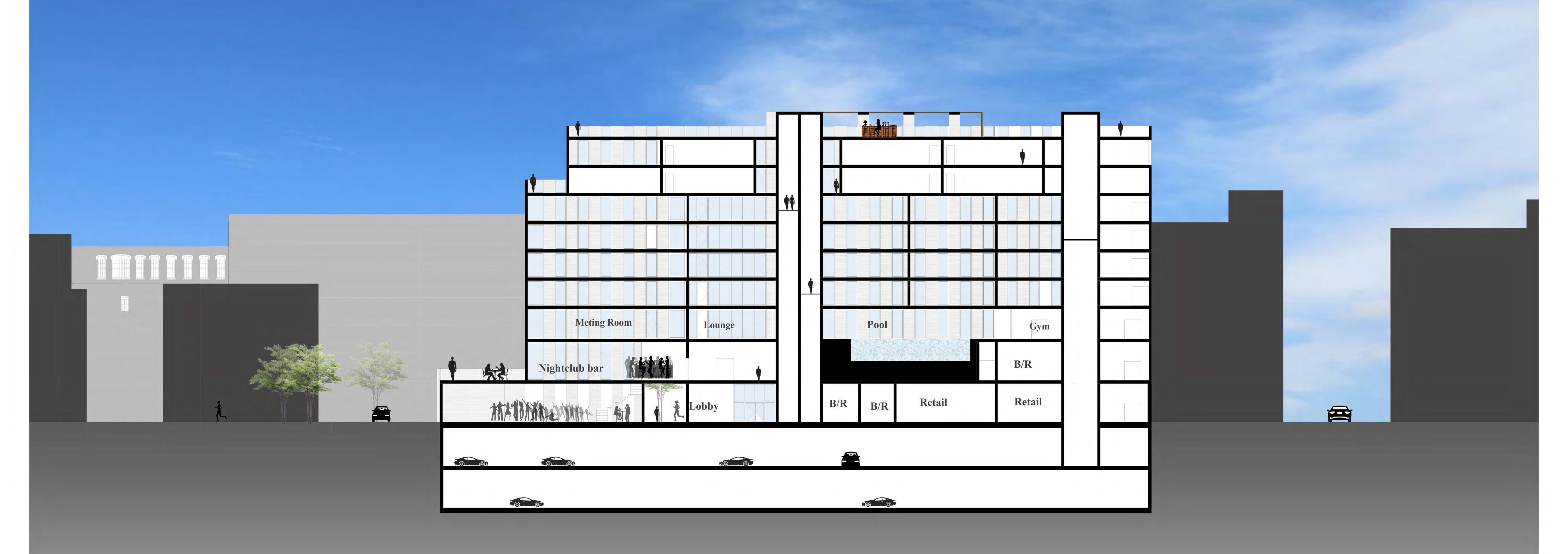 The hotel L is a full Luxury services with public amenities for the south end community. The Building Provides the people with retail and nightclub on the 1st two floors and bring a night life to the neighborhood. Astonishing vies are seeing from the terraces overlooking peters parks with a view of the city. The building façade respect the historic quality of the south end with a brick looking texture and the building main purposes building is to strengthen the community engagement with indoor and outdoor space.
