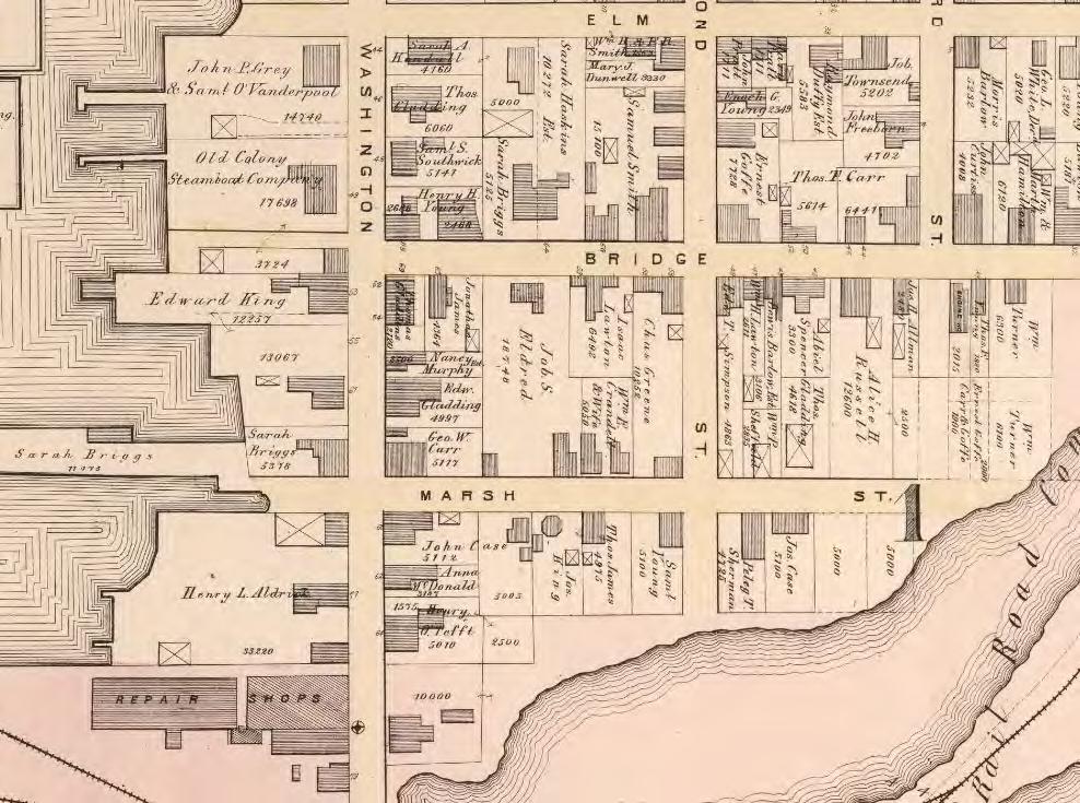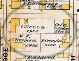 187010 and 187611 the Greene siblings had built a smaller house in the southern part of their property along Marsh Street. It can be assumed that the Greens were renting this property to James Holt because the Greene later sold that part of the property, and the house upon it, to Holt in 1875.12 Charles Greene died by the end of 1875. His inventory not only his belongings, but diverse and sundry pairs of boots, shoes, and slippers valued at $12,465.22 at that time.