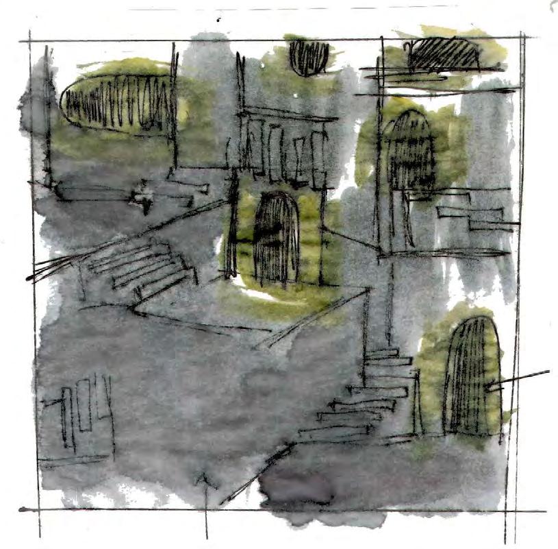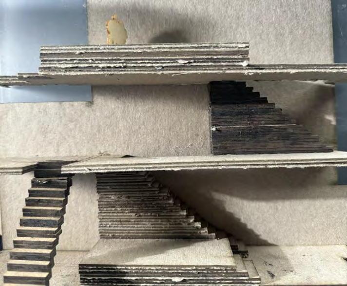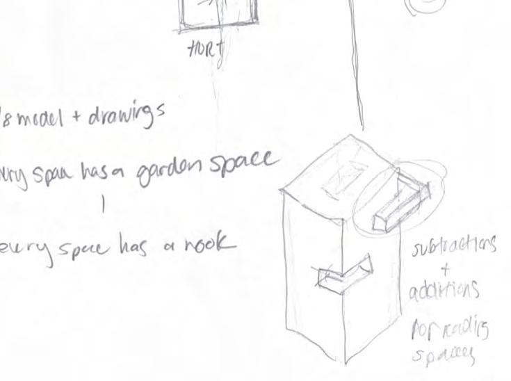 The librarian and the horticulturist’s relationship can be described through Raphaels, School of Athens in which Plato and Aristotle stand at the center of. Plato points up at the sky, inferring that he is satiated by the theoretical and contemplative realm whereas Aristotle points down as he is more concerned with the literal and experiential. With that, a librarian is generally more inward thinking, as they spend a lot of time involved in the theoretical where a horticulturist is generally more outward looking, as they work with their hands, and dealing with the physical. In form, there is a void in both structures, the librarian’s attention is focused inwardly to their void which is the staircase whereas the horticulturist’s attention is always outward looking, out into their void which is an exterior garden. The librarian circulates in their void, where you can see up and down to all floors of the tower where the horticulturist circulates around their void, looking into their garden. The librarian’s home extends out of the horticulturist’s home as they physically ascend up into the sky, or the “heavens”. The volume of the tower can be felt within the horticulturist’s place as the tower drops the regular ceiling height down, reinforcing its permanence, like that of knowledge. The horticulturist’s home hugs the ground, supporting their understanding of life through the physical.