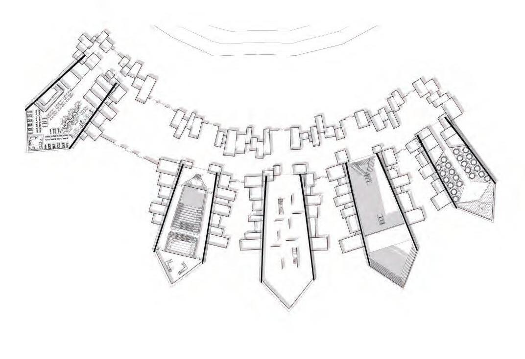 The massive spaces require additional spaces that can offer smaller events to connect the smaller spaces with the main ones. The arrangement of these spaces acts like a village built upon the mountain. The space between the additional spaces creates a private courtyard for continuation purposes and sun exposure, as the irregular Kurdish villages nest among each other and are built in a randomly organized configuration connected to the main pavilion on one end and open to the patio from the other. It also connects the various spaces to a series of gathering zones.