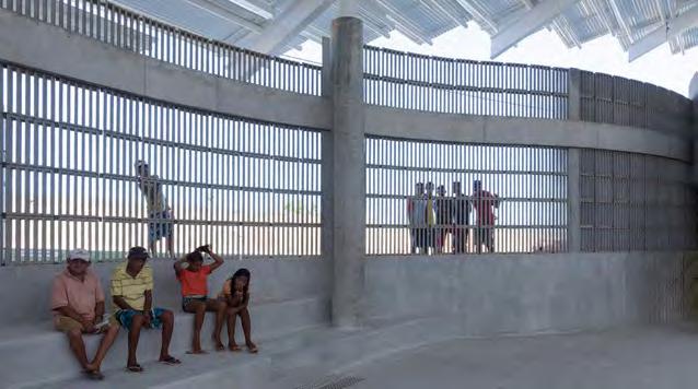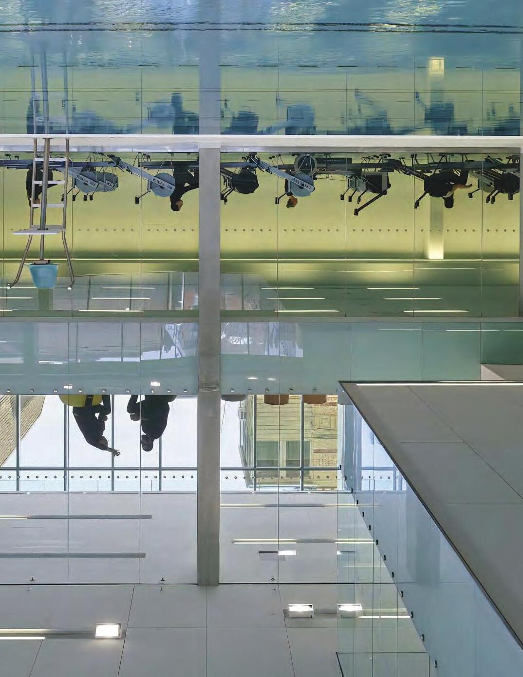 A sports center included an indoor multisport hall at the basement level, a gym area on the second floor, and a swimming pool on the far end of the pavilion, accessed by creating catwalks on the sides of the shell.