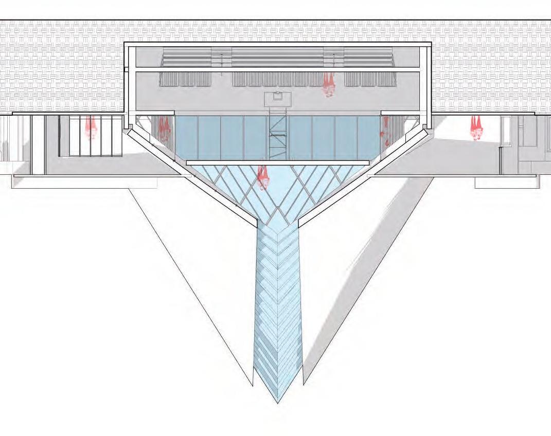 Speaking of the pavilion improvements, a skylight was added to all the triangle-shaped spaces due to the need for natural light to access the extended space. This also helps in the structural spec, where less weight is loaded on the T-line. However, the structure continues to create a rigid frame to maintain the overall dead load from external factors and the concrete shell.