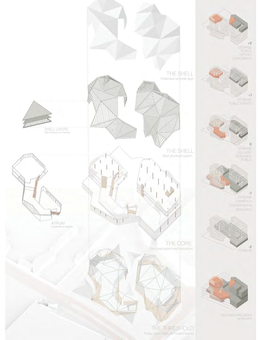 The building is a multi-layered system of aggregation that allows for fluid movement and ease of function. It serves to provide protective layers that houses the archive and therefore preserves the artefacts held inside. The layers radiate from the inside and are shown in the program, massing, and site to emphasize the fluent gestures of the project. This can also be seen in the development of the site which shows the interaction between the sidewalks, the landscape and the building.