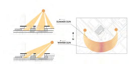 Our building will be shaded through horizontal photovoltaic louvres placed on all facades that are heavily affected by the sun. Each louvre is manipulated based on the summer solstice when the sun will be hitting the hardest. Behind these louvres will primarily be glass, but concrete walls will be in place where the archives will be stored to maintain necessary temperature conditions. It can be noted that there is a lack of louvres where our atrium is located. We will be putting a low emissivity glass here to minimize the amount of heat that can pass through, but still accomplish the design decision to showcase the public circulation and invoke curiosity for passers-by.