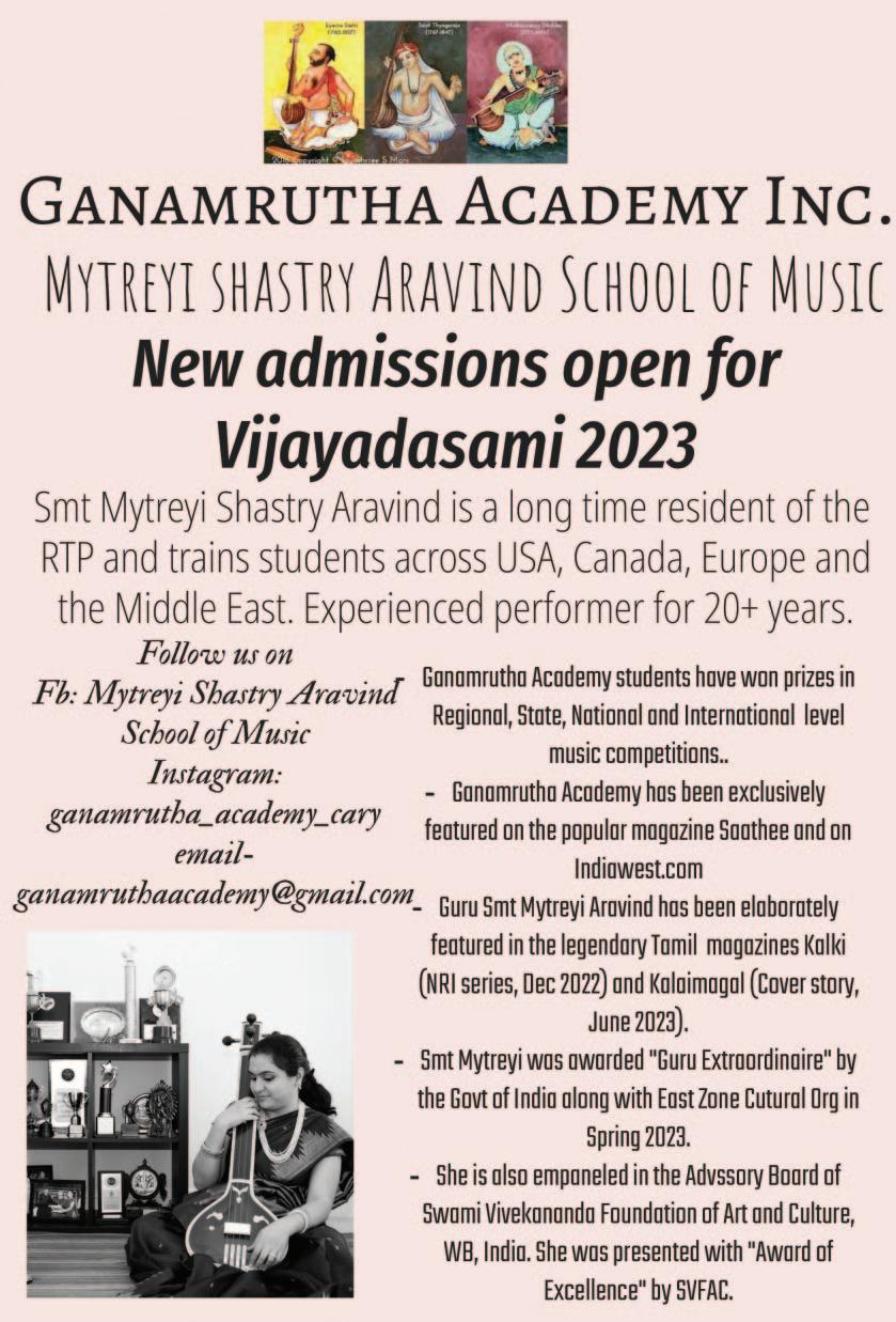 The Classical Music Association of Charlotte presents a Veena Concert by Ramana Balachandran on Saturday, October 7, 2023 beginning 4pm at Hindu Center, Gandhi Bhavan. Accompanied by Patri Satiskumar on Mridangam and Sowmiya Narayanan on Ghatam. Details, call 704-339-4126 or 704-8405949. Also, visit Onlinecmac.org.