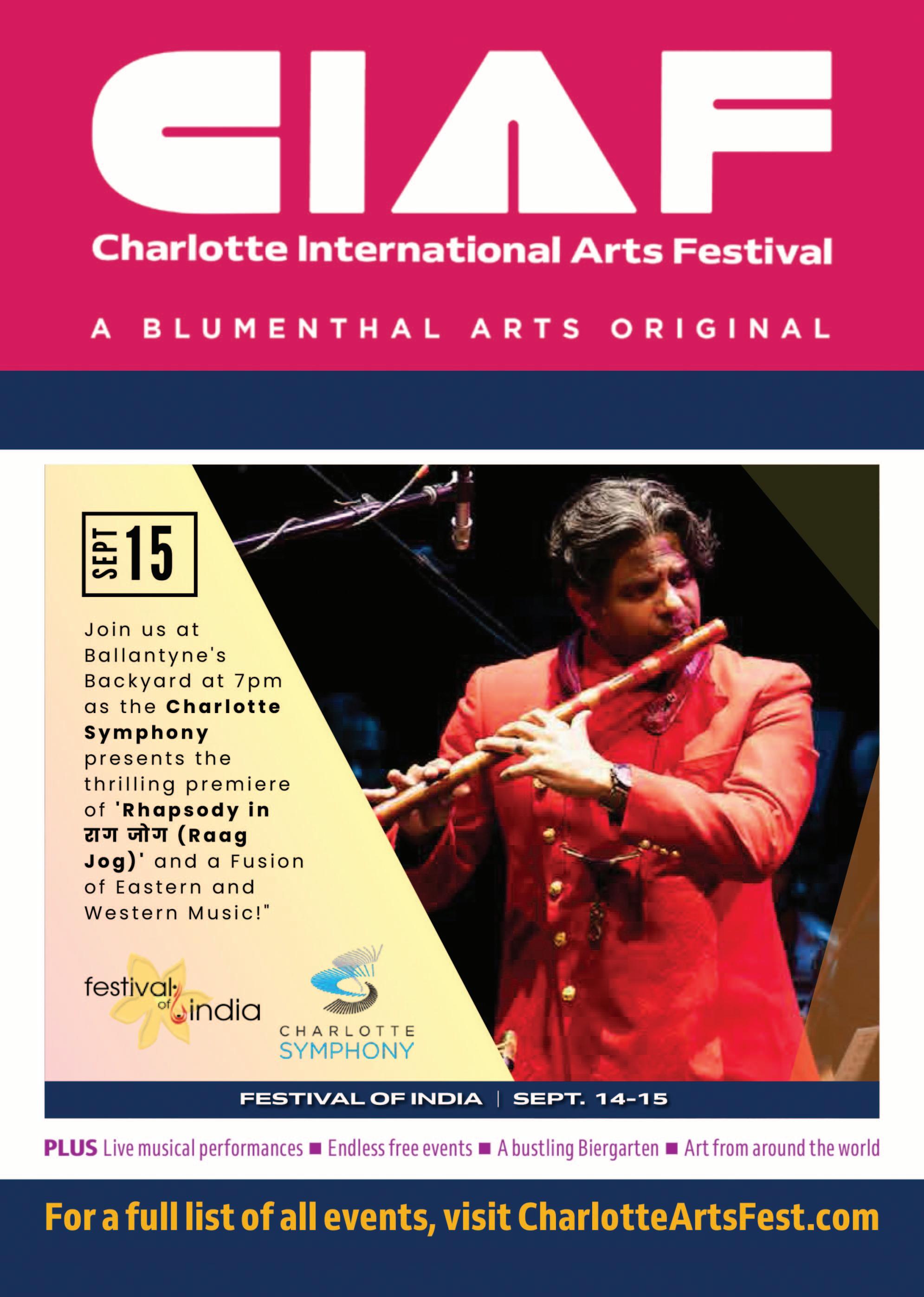 The India Association of Charlotte (IAC) has partnered with the Charlotte Symphony Orchestra (CSO). This collaboration will be showcased at the 28th Annual Festival of India in September. The highlight will be the closing fusion concert on Sunday, September 15, at 7pm, at Ballantyne’s Backyard. The concert will feature the music of Indian composers Shruti Rajasekar, Anoushka Shankar, and A. R. Rahman, serving as a bridge for cultural exchange through symphonic music. Additionally, the concert will include the Charlotte premiere of “Rhapsody in Raag Jog,” a work by composer Drew Zaremba. This piece features bansuri flutist and saxophonist Anjan Shah and epitomizes a fusion of Eastern and Western musical traditions. Info: Charlotteartsfest.com.