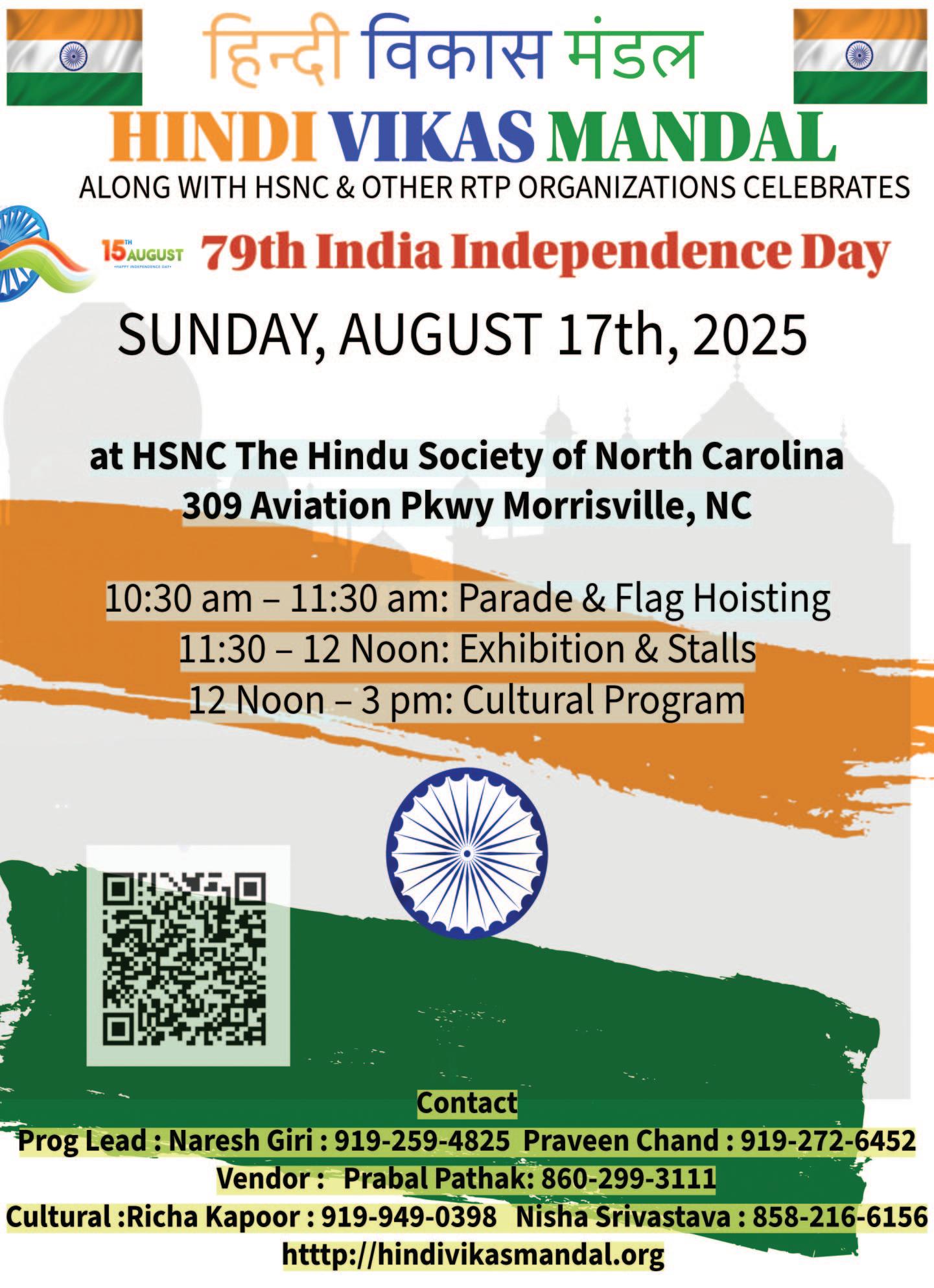 Hindi Vikas Mandal, along with HSNC and other RTP organizations will celebrate India’s 79th Independence Day on Sunday, August 17, 2025, from 10:30am – 3pm at HSNC in Morrisville, NC. Enjoy a parade, flag hoisting, exhibitions and stall and a cultural program. For more details, call 919-259-4825 or visit Hindivikasmandal.org.