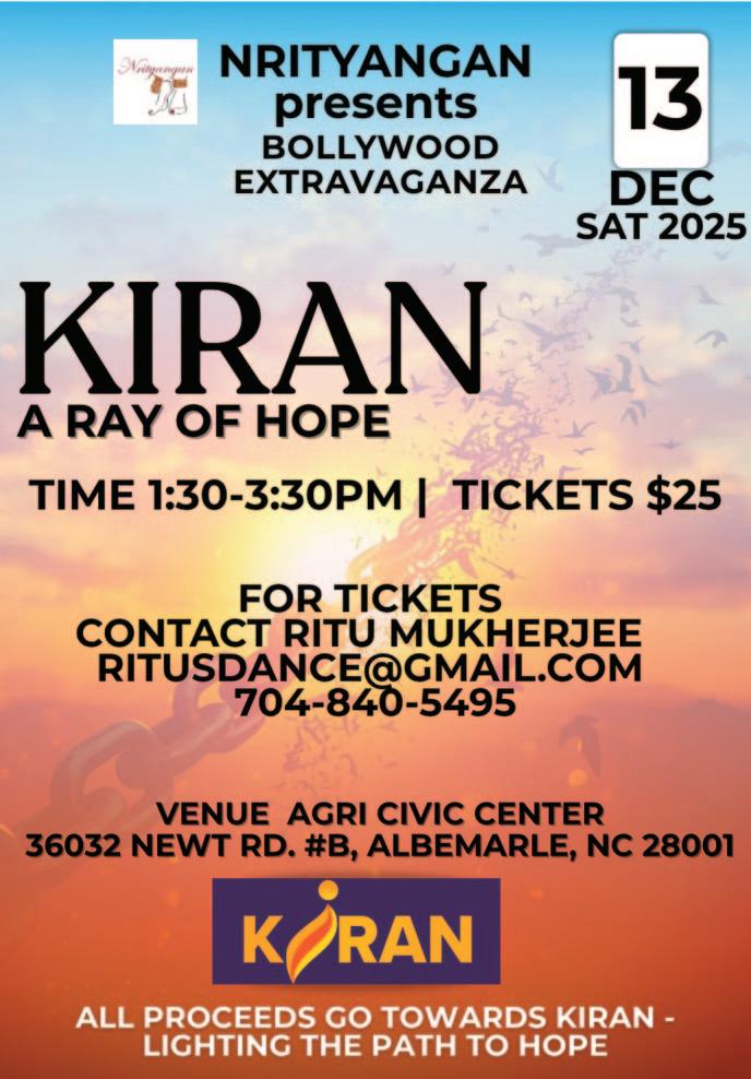 Nrityangan presents a Bollywood extravaganza to help raise funds for Kiran. It will take place on Saturday, December 13, 2025, from 1:30 –3:30pm, at Agri Civic Center, 26032 Newt Rd., #B, Albemarle, NC. Find info about Kiran at Kiraninc.org. For more details, call 704-840-5495 or write Ritusdance@gmail.com.