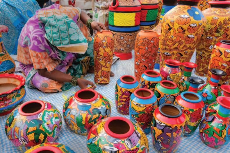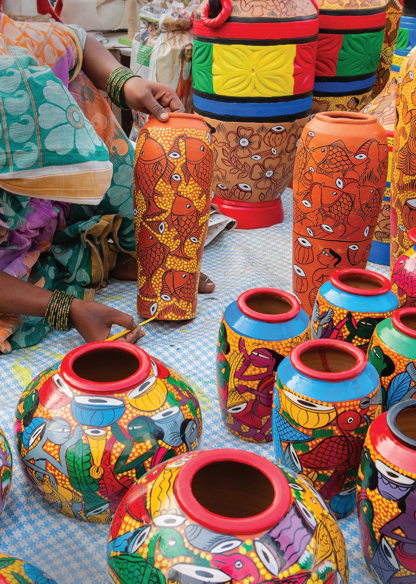 A woman artist painting colorful terracotta pots, works of handicraft, for sale during Handicraft Fair in Kolkata.