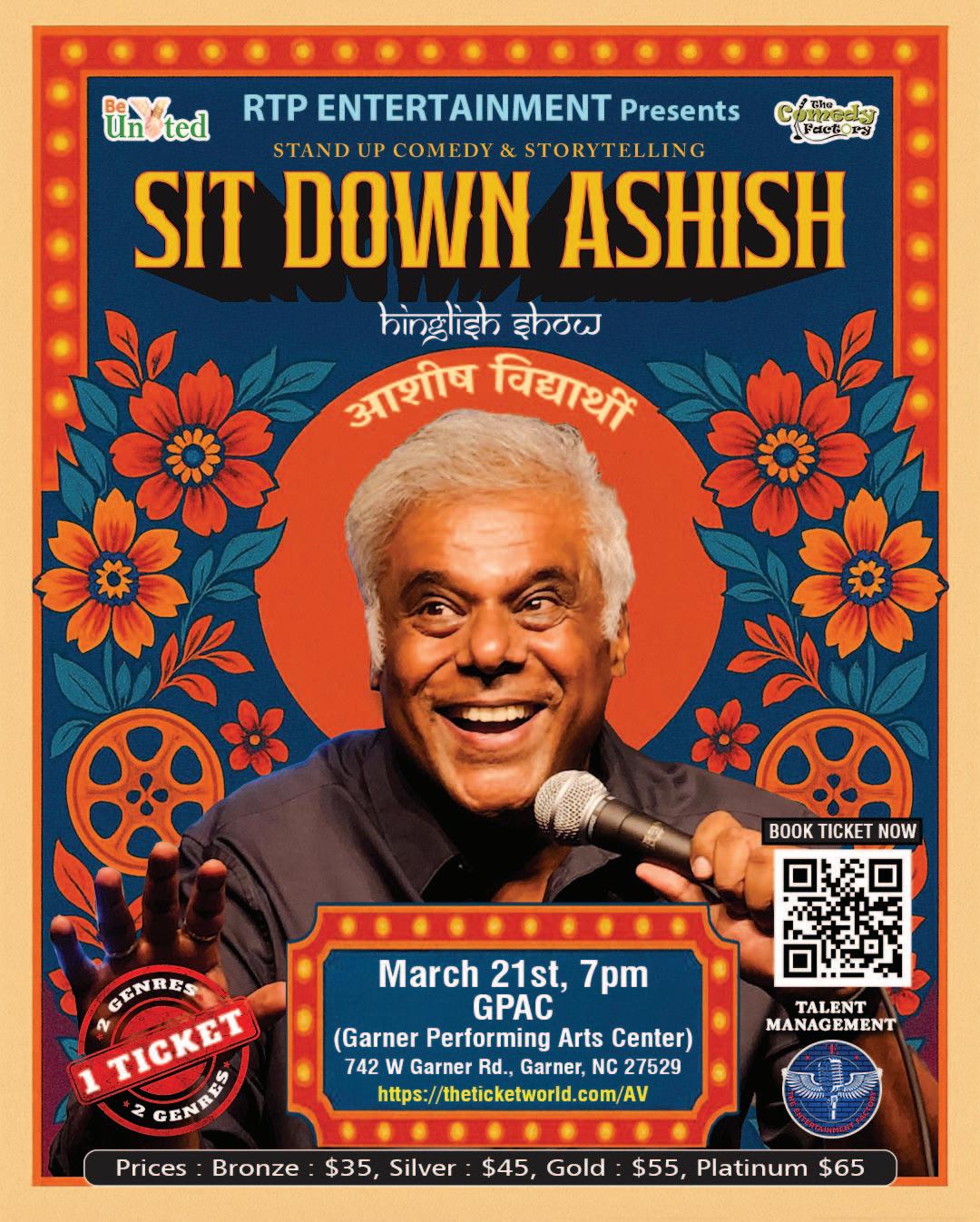 Enjoy stand-up comedy and storytelling with Ashish Vidharthi on Saturday, March 21, 2026, beginning at 7pm, at Garner Performing Arts Center, 742 W Garner Rd, Garner, NC. Presented by RTP Entertainment. For more details, visit Theticketworld.com/AV.