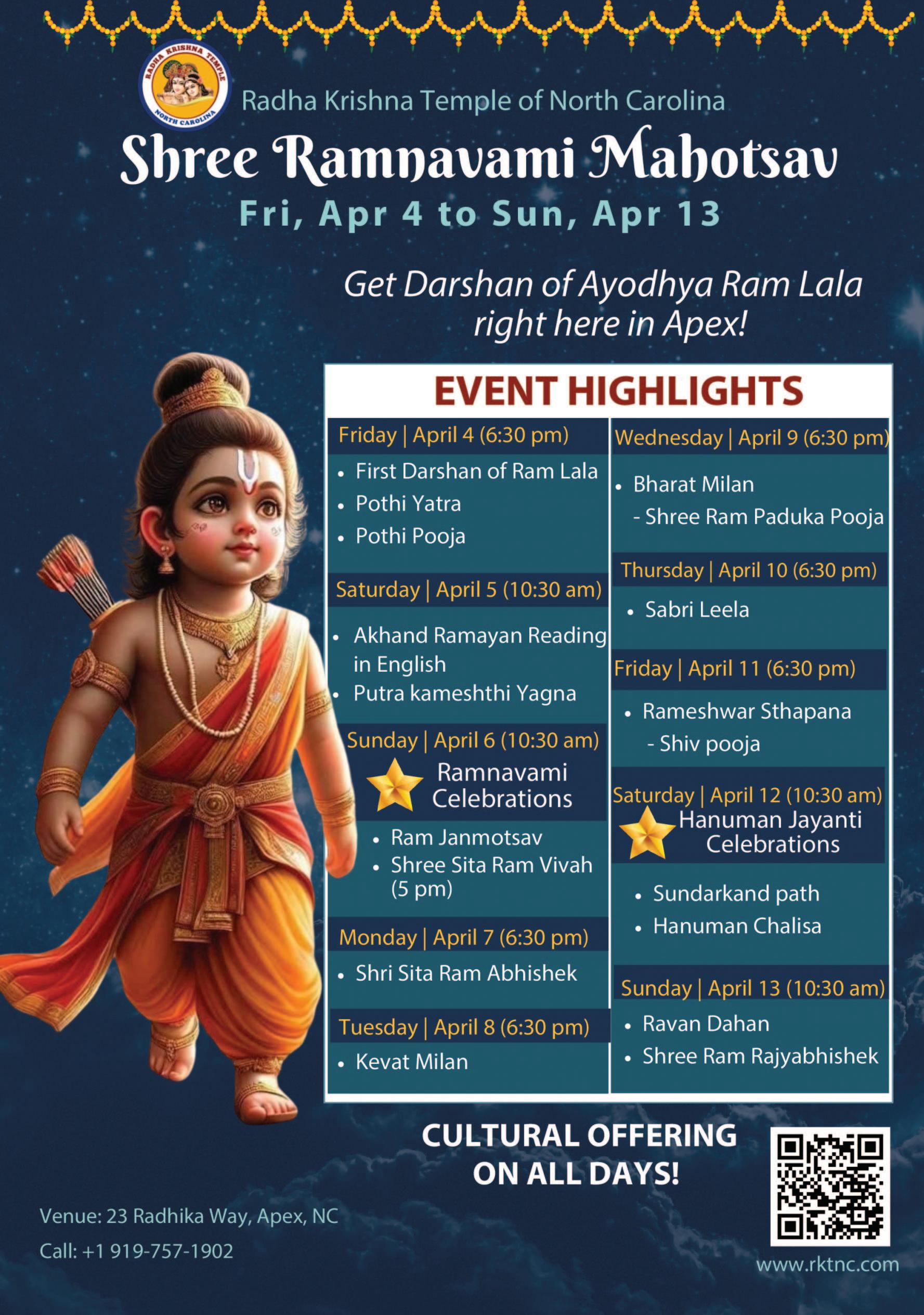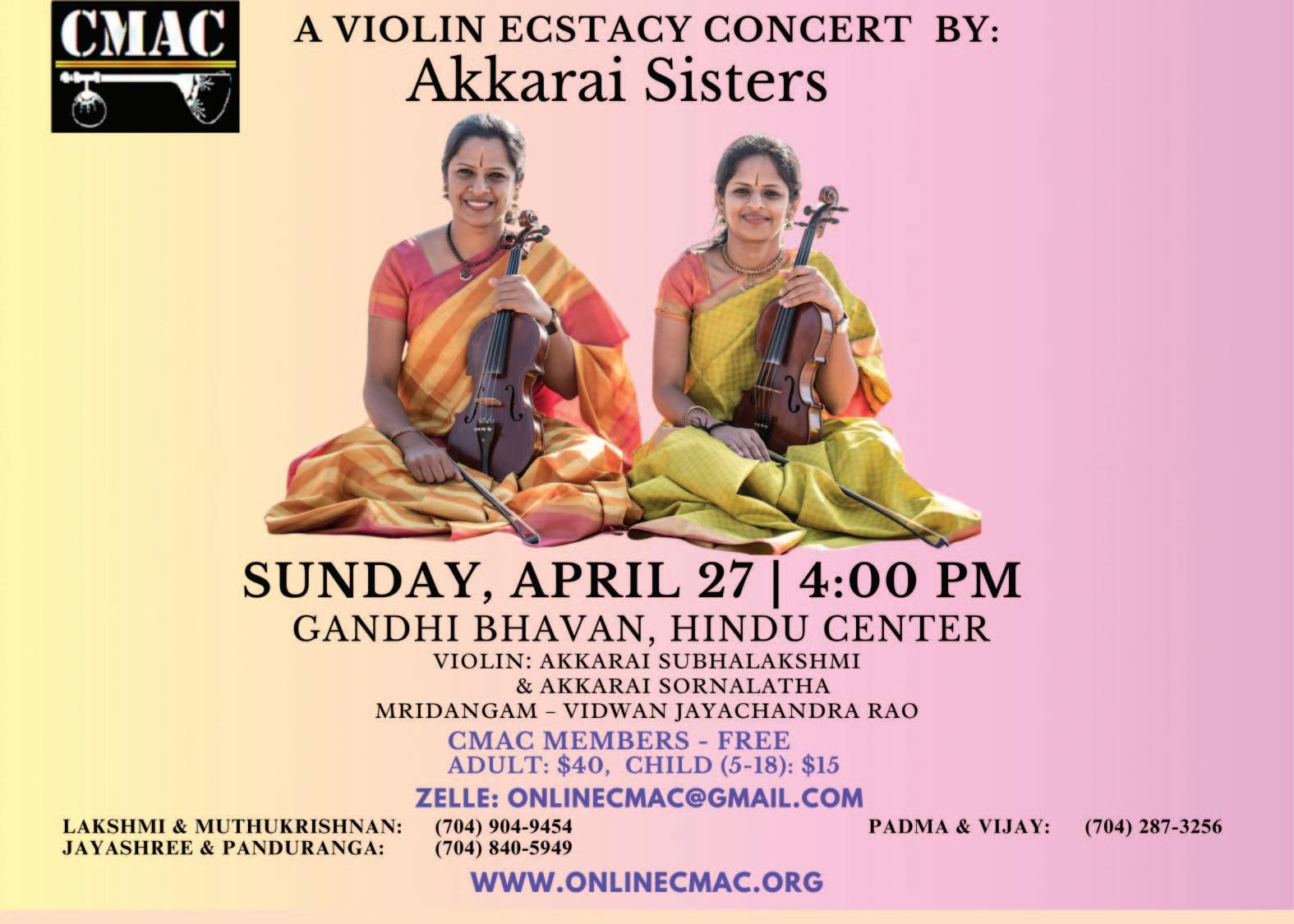 Radha Krishna Temple of NC and South Indian Fine Arts Academy present an evening with vocalist Sooryagayathri on Saturday, April 12, 2025 at 4pm. She will be accompanied by Adarsh Ajaykumar (violin), Prasanth Sankar (tabla), PV Anilkumar (mridangam) and Silesh Marar (percussion). Venue is Alston Ridge Middle School, 7833 Fussell Ave., Cary, NC. Info 919-803-9984 or visit Rktnc.com.