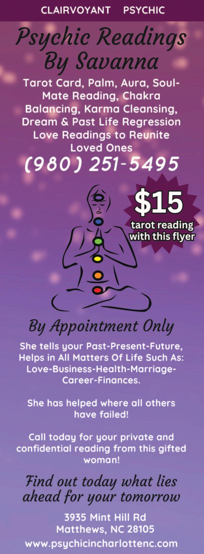 Psychic Readings by Savanna: Removes all bad luck, negative energy and does chakra balancing and karma cleansing. Plus Tarot card, palm, aura and soulmate reading. Call for free consultation Savanna: 980-251-5495