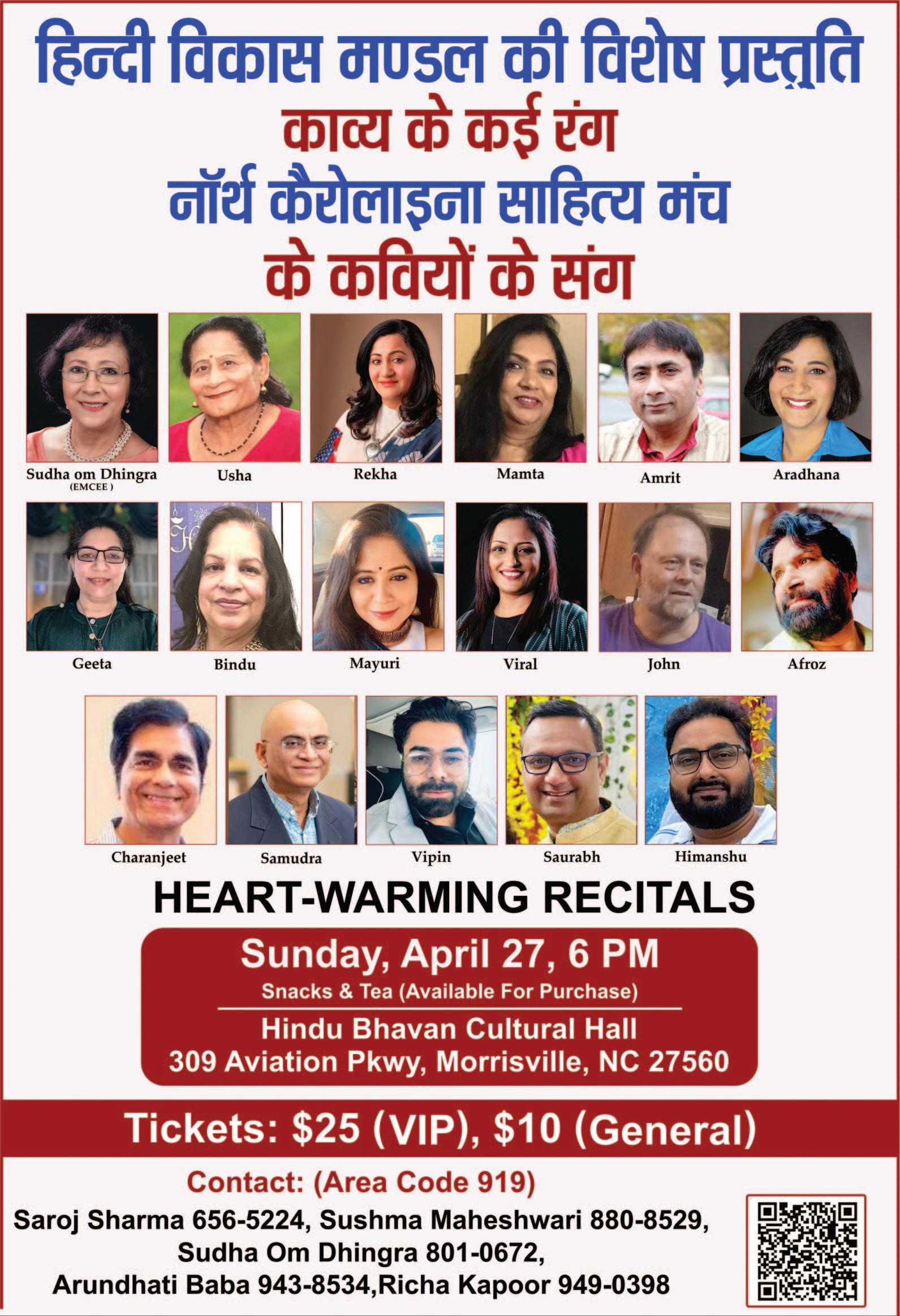 Hindi Rang Manch presents the Hindi natak “Adhe Adhure” on April 5 & 6, 3pm at Durham Arts Council, 120 Morris St., Durham, NC. Written by Mohan Rakesh and directed by Nileena Pani Dash. Info, call 919-824-6931 or 919-621-1181.