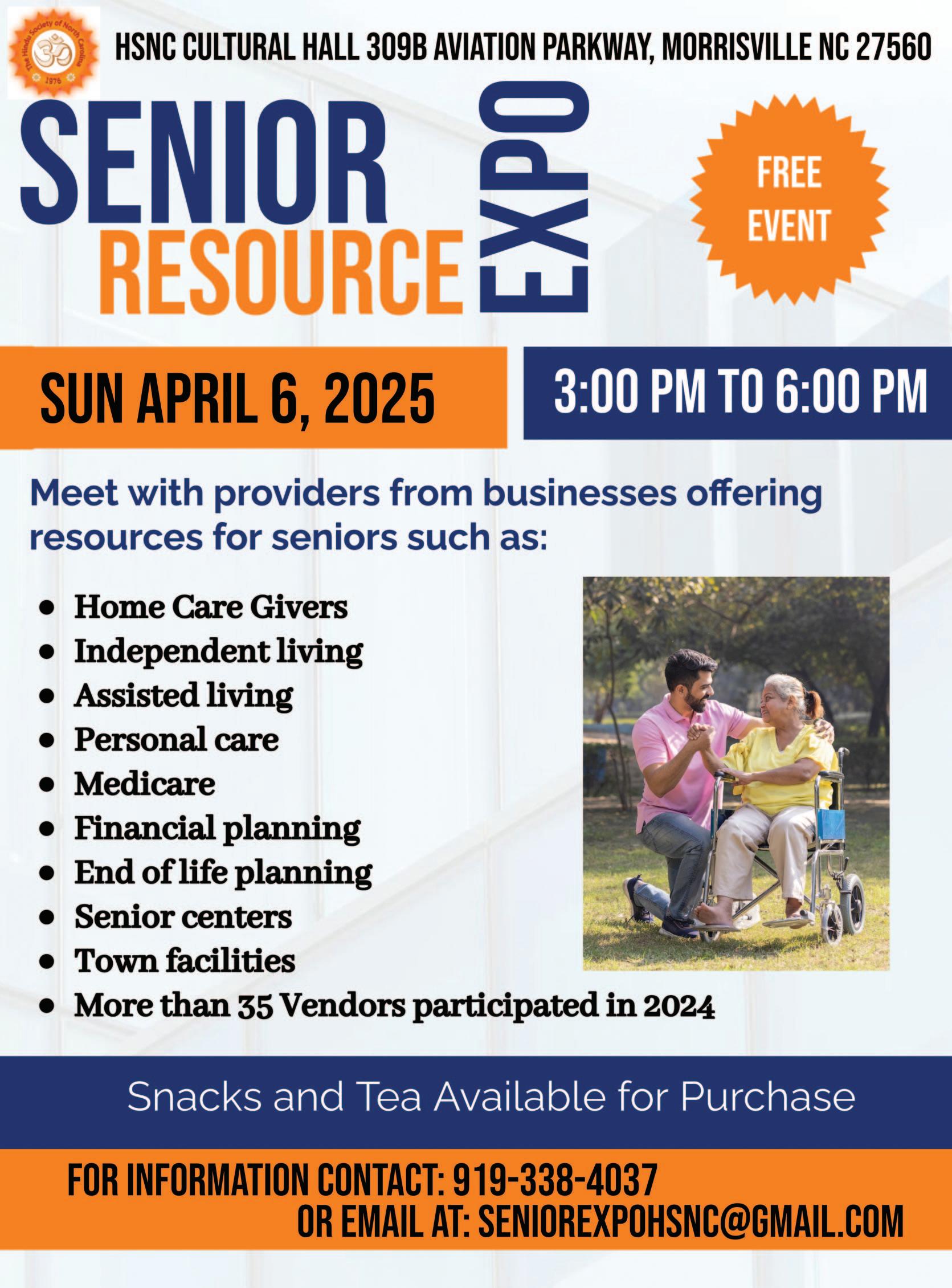 Meet with providers from businesses offering resources for seniors such as: Home Care, Independent and Assisted Living, Personal Care, Medicare, Financial Planning, End of Life Planning, and more. Snacks and tea are available for purchase. Entry is free. HSNC Cultural Hall, 309 B Aviation Pkwy, Morrisville, NC. For more details, call 919-3384037 or write to SeniorExpoHsnc@gmail.com.