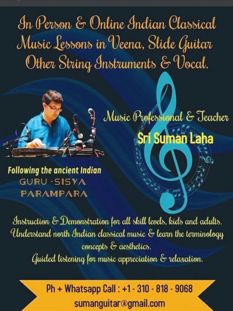 Indian Classical: Veena, slide guitar, other string instruments & vocal for all ages. Music professional and teacher Sri Suman Laha. Contact: sumanguitar@gmail.com or WhatsApp +1 310-818-9068.