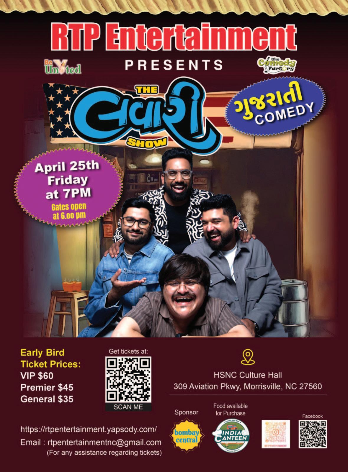 Charlotte Gujarati Samaj and Hindu Center present the Gujarati natak “Wife Happy to Life Happy” on Friday, April 11, 2025. Dinner is from 6:30 - 7:30pm and natak begins at 7:30pm. Nimesh Shah and Mallika Shah star in the comedy. At Vihar Hall, 7400 City View Dr., Charlotte. For more details, call 704915-2939 or 803-412-1805. Dinner and tea are included in the ticket price.