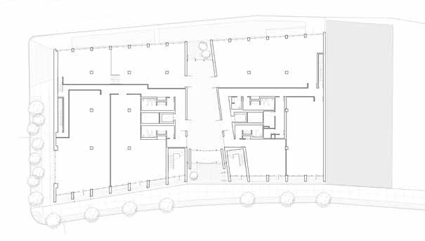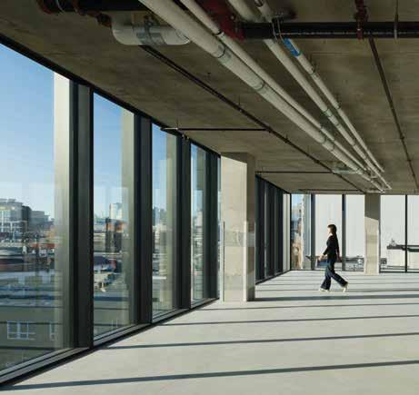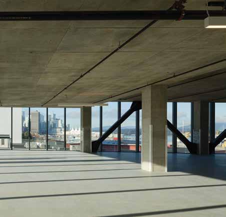 At grade, curtainwall fills the void between the concrete structural fins. Starting at the second level, the structure is wrapped in a blanket of triple-glazed unitized curtainwall with integrated fins. The 265mm deep fins create a regular grid that produces a dynamic effect; when approached obliquely, the façade appears opaque, but when viewed head-on it reveals itself as fully glazed. Interior spaces are configured to maximize flexibility and durability. The floors provide all the qualities that designers love about historic brick and beam workplaces without the dust, draughts, poor acoustics, energy inefficiency, and obtrusively placed pipes and cables which can occur in adaptive reuse projects.