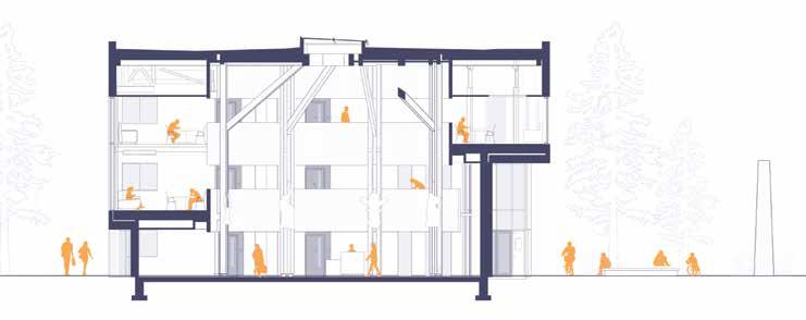 The student housing component integrates 36 modules that were built off-site, allowing for faster delivery times. Energy modelling and rigorous airtightness testing resulted in a highperformance building envelope that contributes significantly to the new residence being net-zero ready.