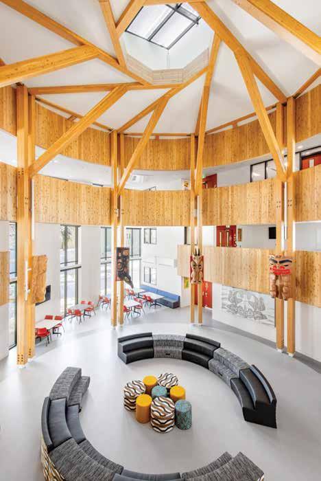 The three-storey 40,473 sq.ft. building embraces First Nations culture and exceeds goals for durability and energy efficiency. It combines light wood-frame modular student housing units grouped around a mass timber central pin-wheel structure atrium which is inspired by traditional Northwest Coast Indigenous architecture and honours each Nation the college serves.