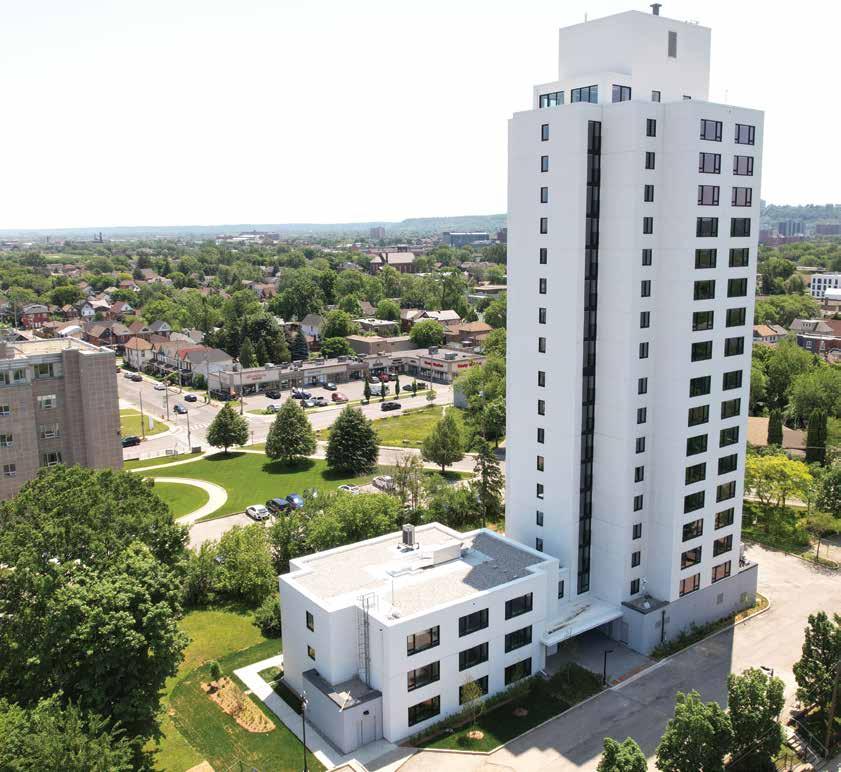 ERA Architects had been working for over a decade on the Tower Renewal Project, a strategy for the revitalization of Canada’s aging postwar apartment neighbourhoods, through which we gained experience on tower retrofits. As part of the Hamilton City Housing portfolio of build ings, the Ken Soble Tower was in a distressed, abandoned condition. Based on our experience, we were brought in to do an assessment of what to do: tear it down or retrofit.