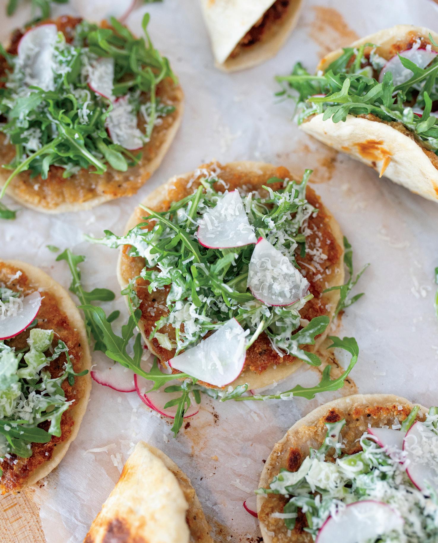 5. Top each taco with the arugula mixture, adding Parmesan and sliced radishes for garnish.