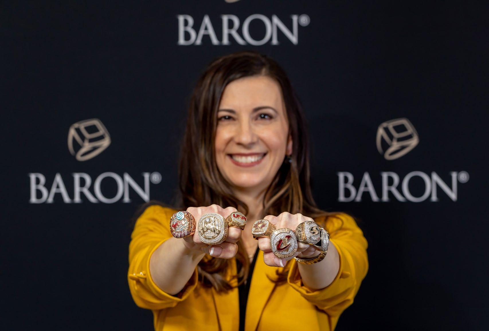 She says that the Cavs experience was a door-opener for Baron. Cleveland owner Dan Gilbert purchased over 2,600 rings to give to everyone from the players to the sponsors, to the concession staff. The other effect was that other teams were suddenly drawn to their designs, teams like the Toronto Marlies of the American Hockey League, Winnipeg Blue Bombers of the Canadian Football League, New York FC, LAFC, and Columbus Crew of Major League Soccer, the Rochester Knighthawks of the National Lacrosse League, several NCAA programs, and the Toronto Raptors' affiliate 905 Raptors.